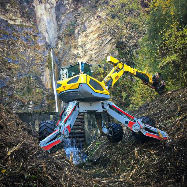모든 지형에서 굴삭기(포크레인)이 필요한 모든 작업을 할 수 있습니다. 땅파기, 토사옮기기, 벌목하기, 중량물 이동하기 등. 바퀴달린 4족보행 로봇같이 생겼습니다. 그런 물건이 실용적인 목적으로 개발되어 판매 중이라는 점에서 매우 인상적입니다.