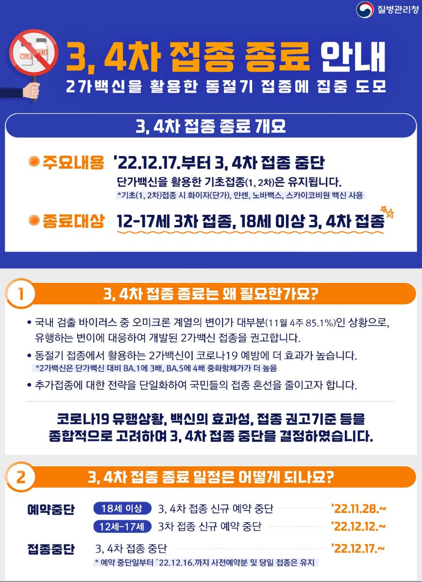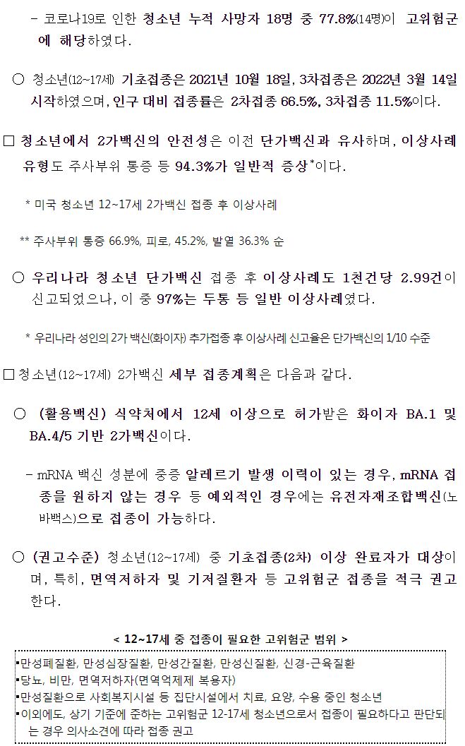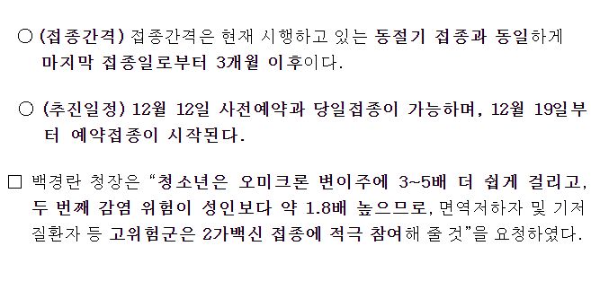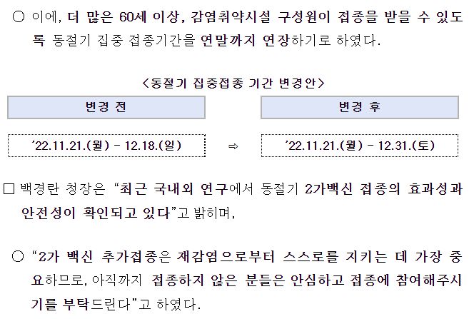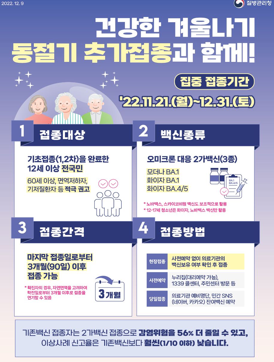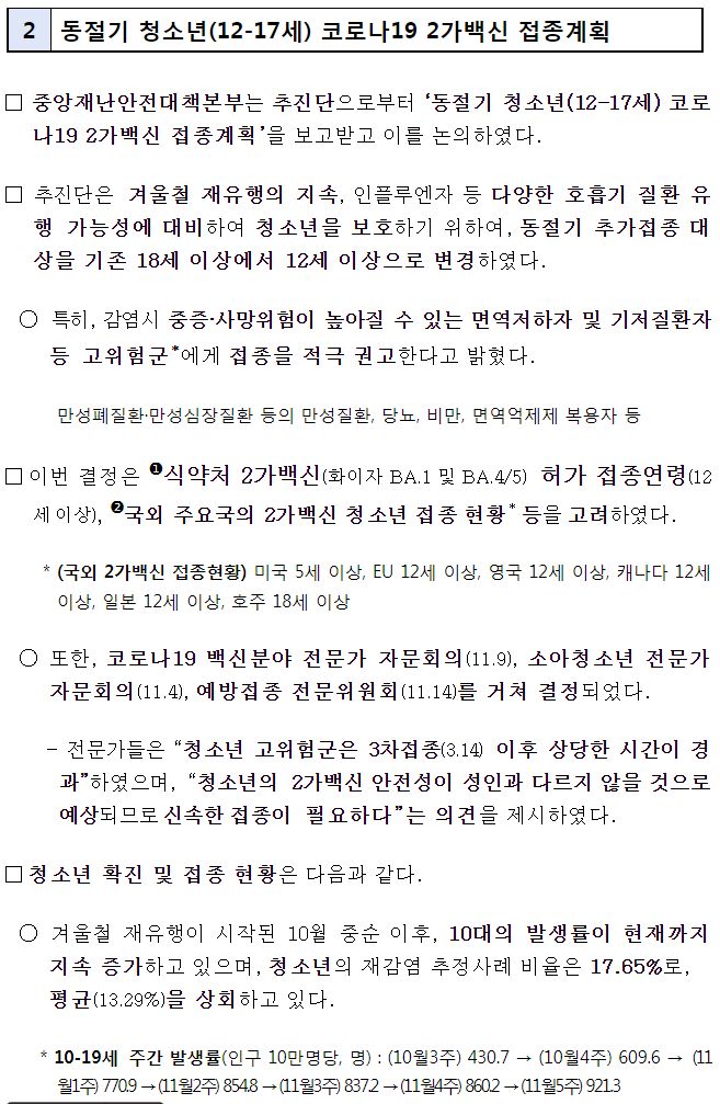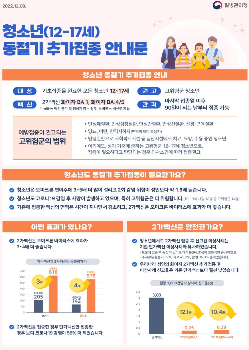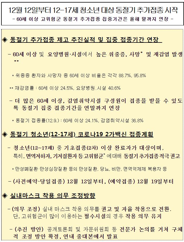 코로나19(2022.12.9) 동절기 집중접종 기간 → 12.31까지 연장. 동절기 청소년(12-17세) 코로나19 2가백신 접종 등 본문