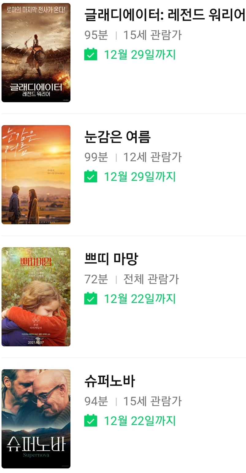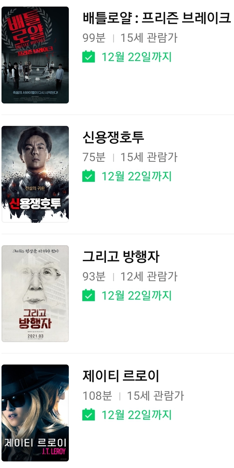 | (네이버 시리즈온 무료영화) 쁘띠마망, 슈퍼노바, 배틀로얄: 프리즌 브레이크, 기묘한 가족, 지구최후의 날 2021, 매직아치 (0) | 2022.12.09 |