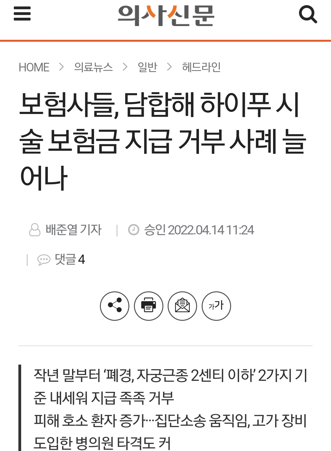 그래서 의료실비보험(실손보험)을 든 환자라면 의사가 권하면 실손보험에서 나가겠지생각하고 동의하는데.. 보험사들이 지급거부하는 경우가 있다고. 그 중 하나가 주로 자궁근종 등에 적용하는 하이푸(고강도초음파집속술, High Intensity Focused Ultrasound; HIFU) 시술.