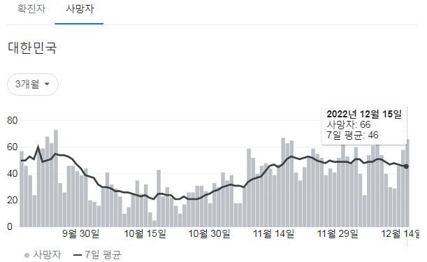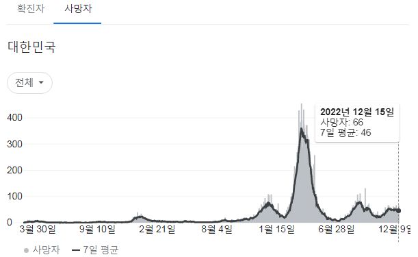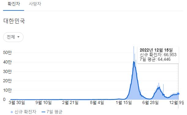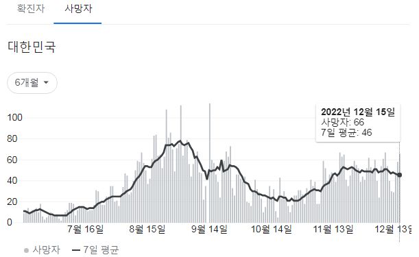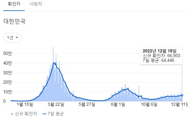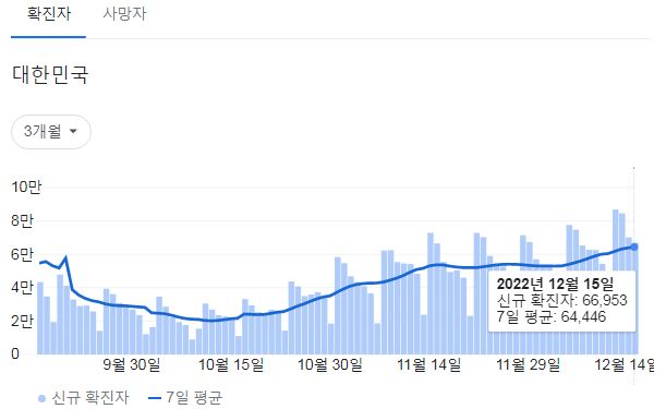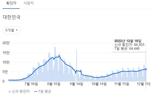 | 코로나19집계(2022.12.15. 0시기준): 확진 +7만, 사망 +58명, 중환자병상가동률 35% (0) | 2022.12.15 |