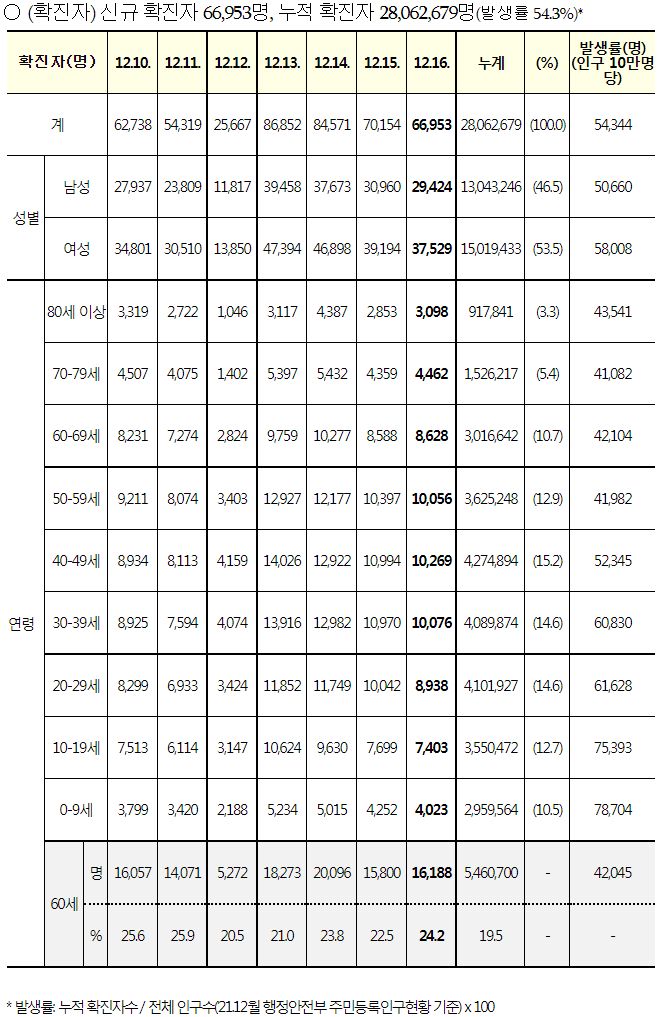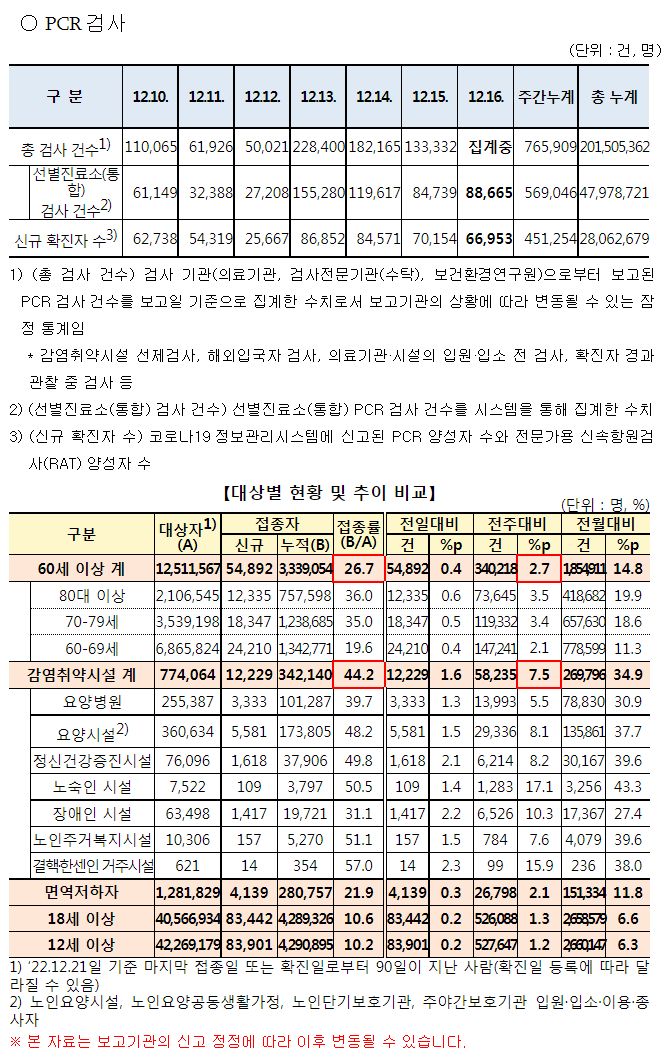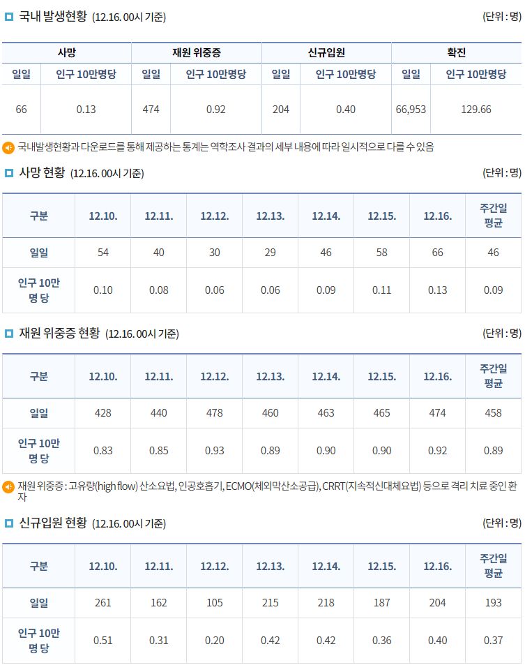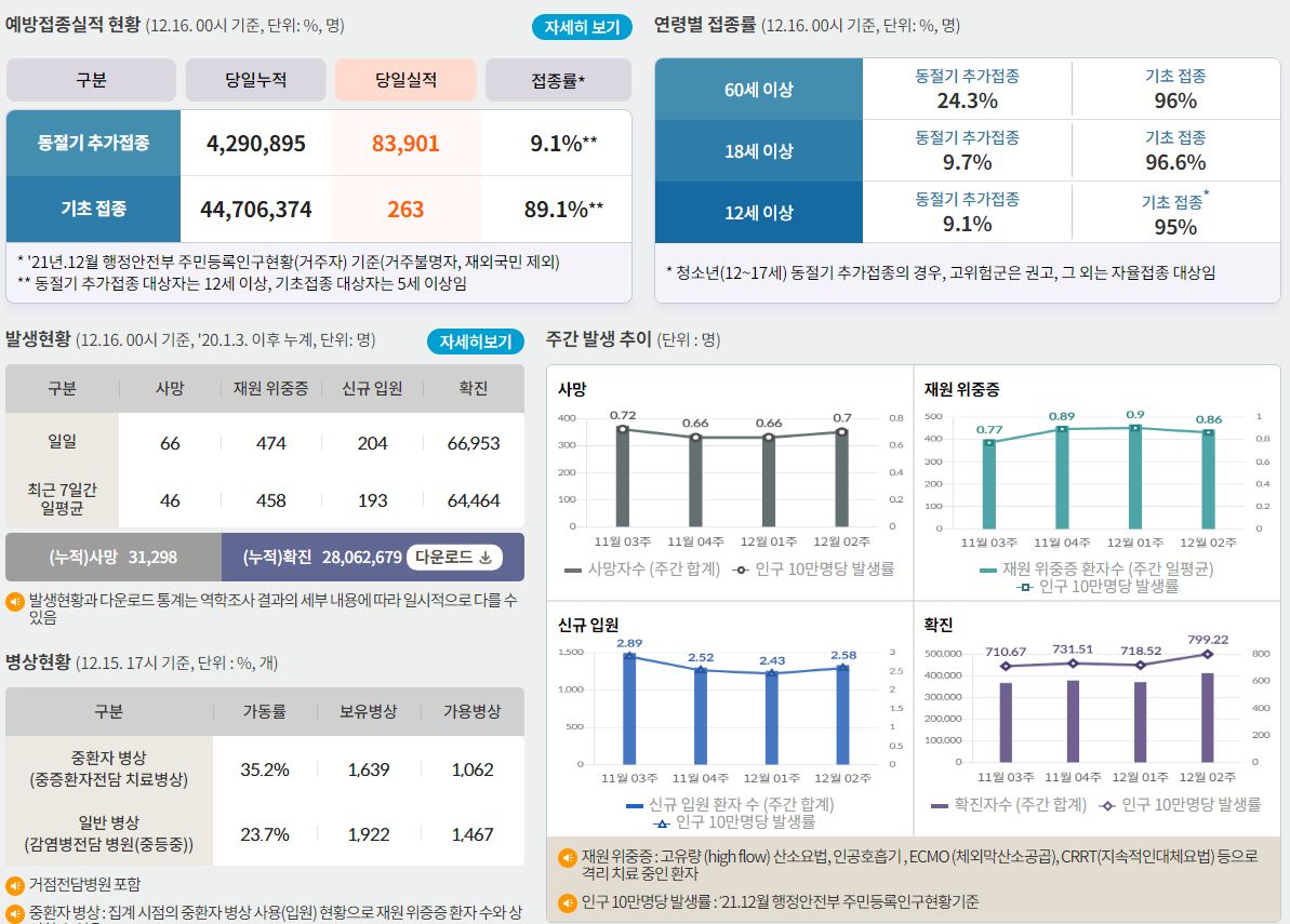 코로나19집계(2022.12.16. 0시기준): 확진 +6.7만, 사망 +65명, 중환자병상가동률 35% 본문