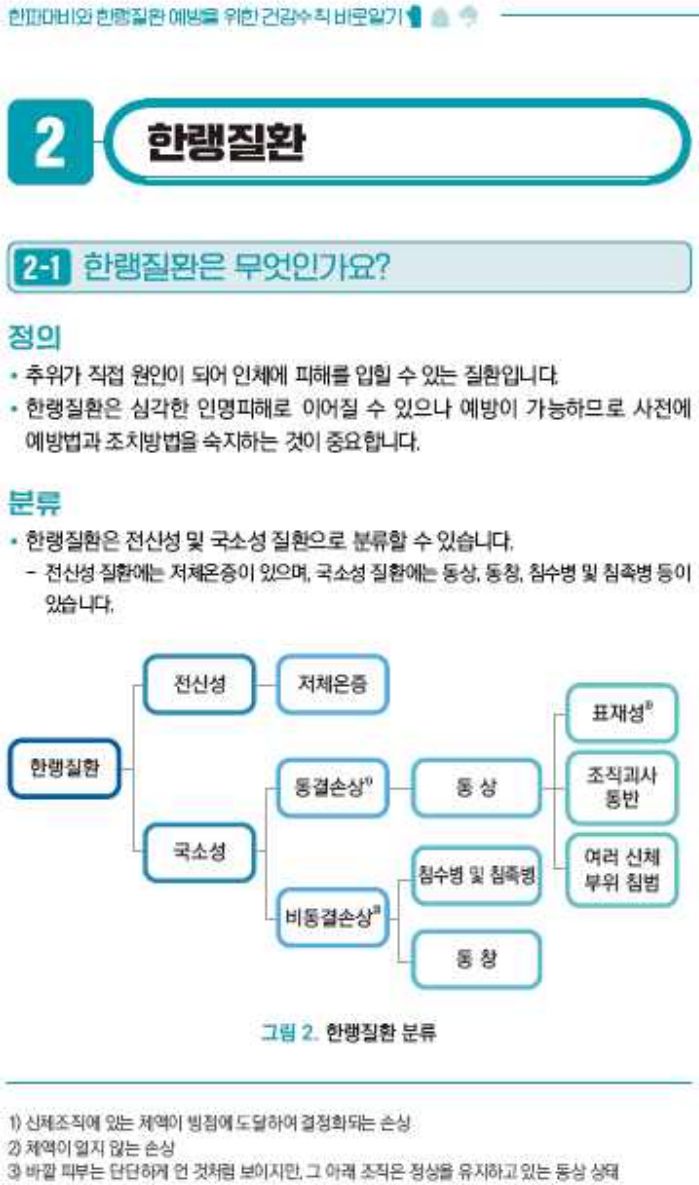 * 한랭질환은 추위가 직접 원인이 되어 인체에 피해를 줄 수 있는 질환으로, 저체온증, 동상, 동창이 대표적.