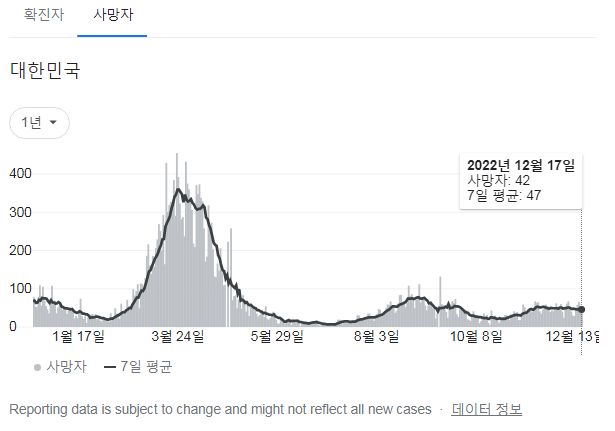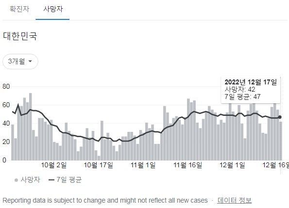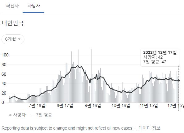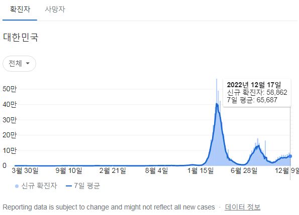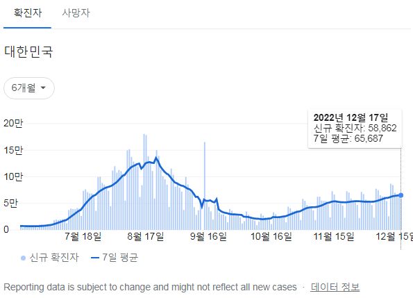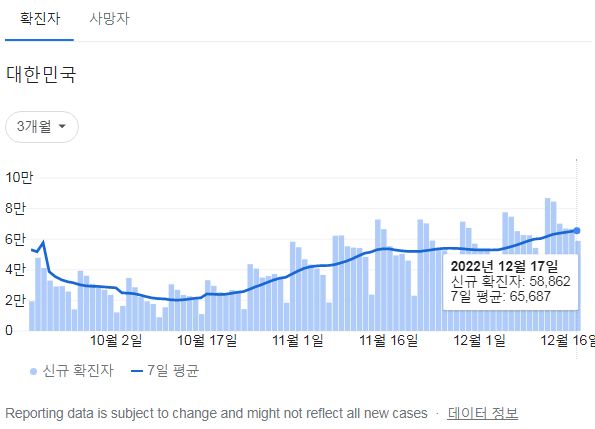 | 코로나19집계(2022.12.15. 0시기준): 확진 +7만, 사망 +58명, 중환자병상가동률 35% (0) | 2022.12.15 |