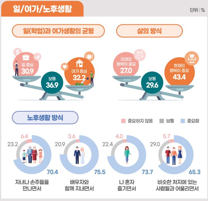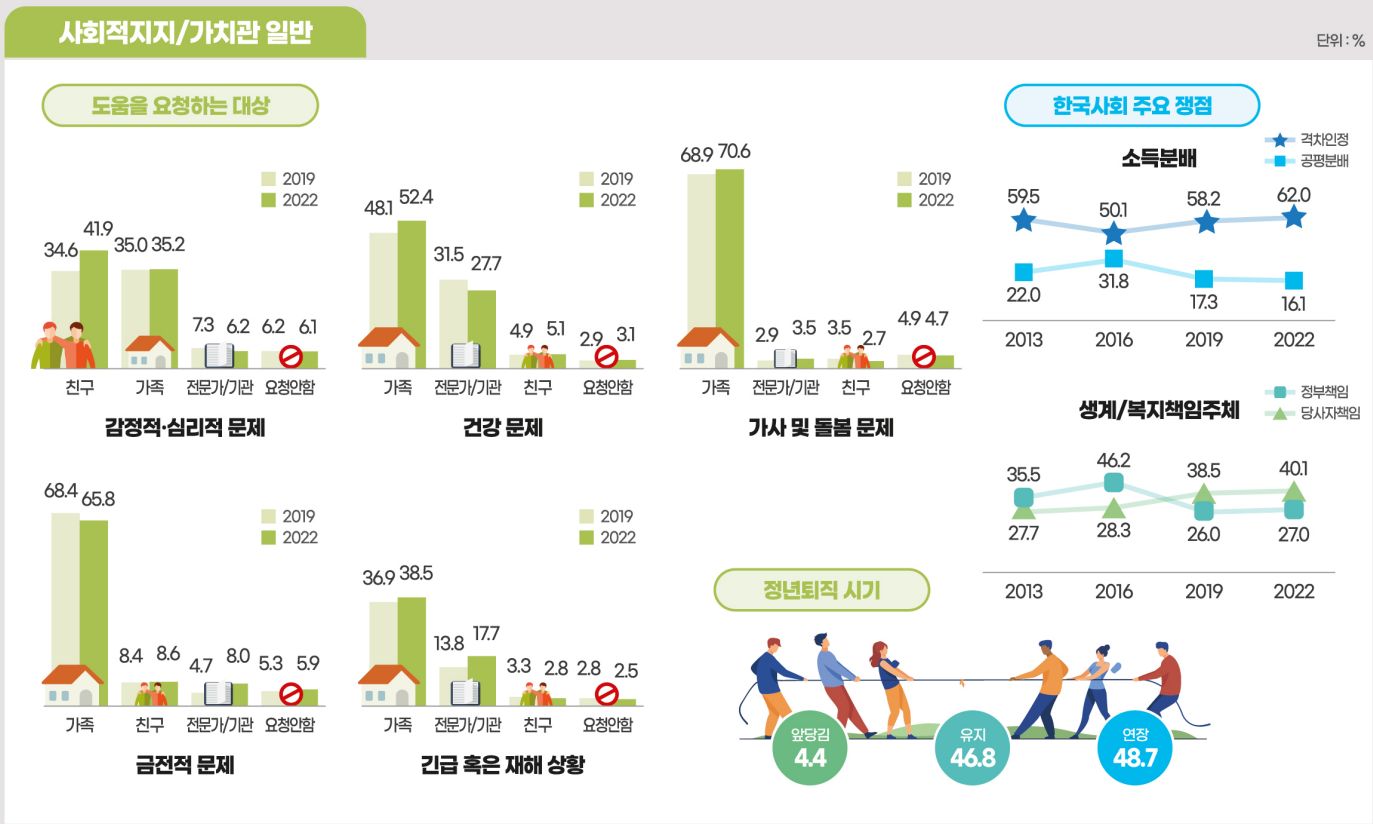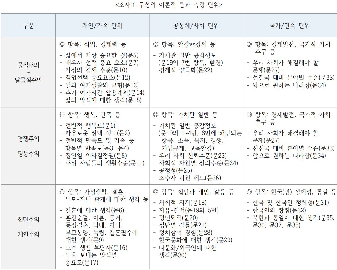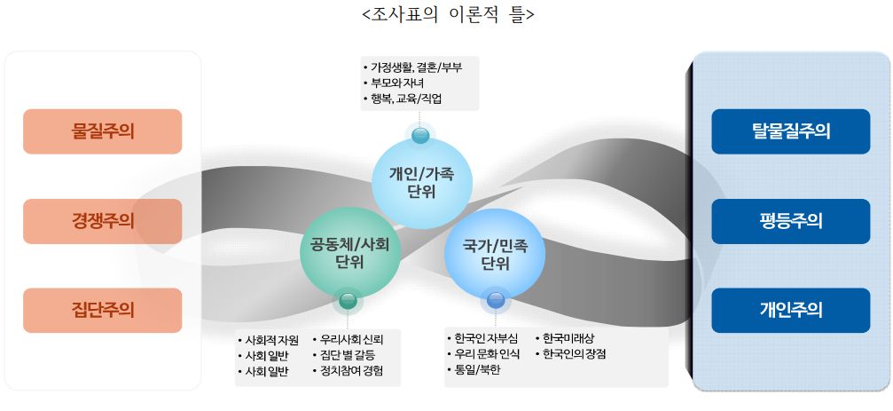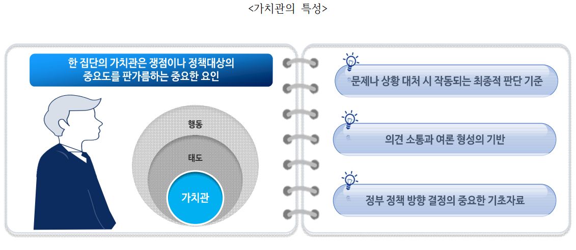 ❍ 사람이 어떠한 문제나 상황을 마주했을 때 가치관은 그 문제나 상황들을 풀어내거나 대처할 때 작용될 수 있는 궁극적이고 최종적인 판단의 기준점임 더 나아가 사회 구성원들은 각자의 가치관을 토대로 의견 . 소통과 여론을 형성하기 때문에 정치와 정부 정책 방향 결정에 있어서 대한민국 국민들이 어떠한 의식 및 가치관을 가지고 있는가를 파악하는 것은 매우 중요한 과업이라 할 수 있음