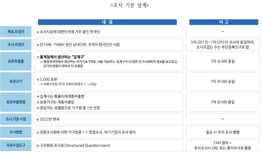 제1장. 조사 개요 1. 조사 내용 2. 조사 연혁 3. 조사 설계 4. 2022년 과업 특징 5. 조사표 구성 6. 실사 설계 및 자료 처리 7. 응답자 특성 8. 조사결과 해석 시 유의사항 제2장. 주요 결과 요약 1. 시계열