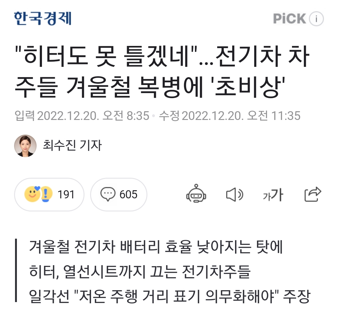 그리고 여기에 더해, 추운 날 실내온도를 올리려고 히터를 켜면 주행거리는 더 줄어든다는 얘기로 가는 듯.