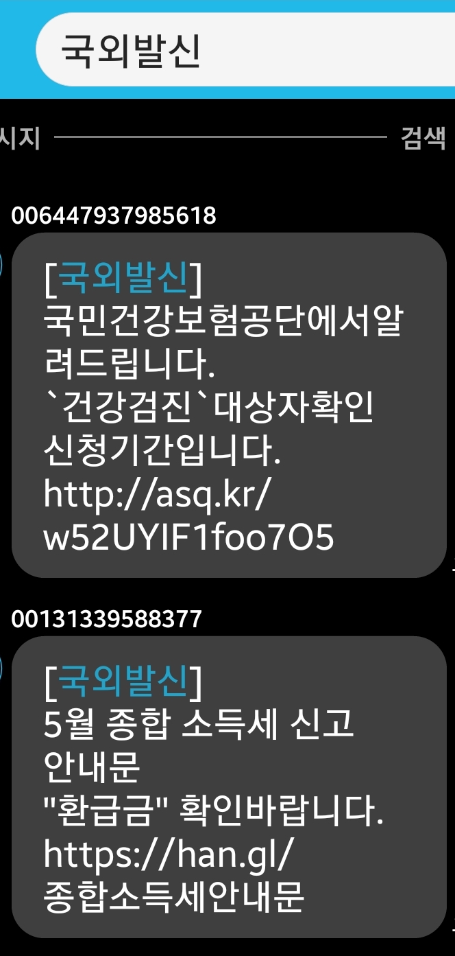 국외발신 사기(피싱)문자들: 국세청, 국만건강보험공단 사칭 본문