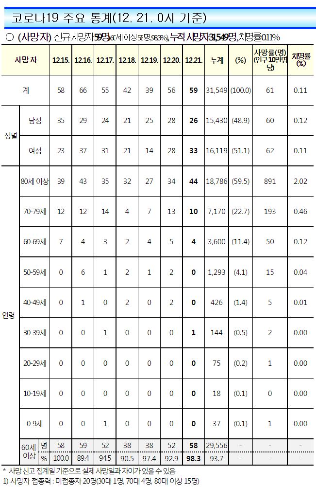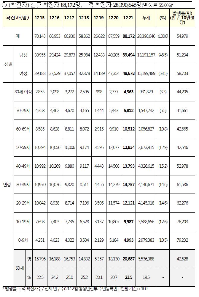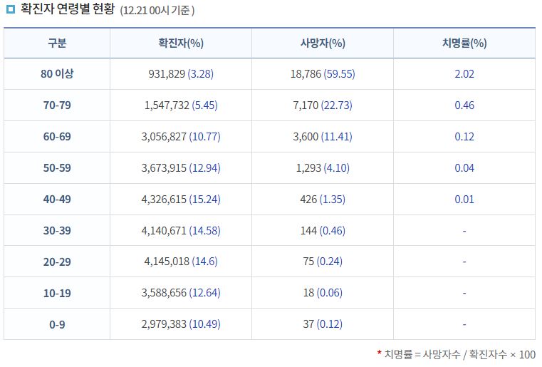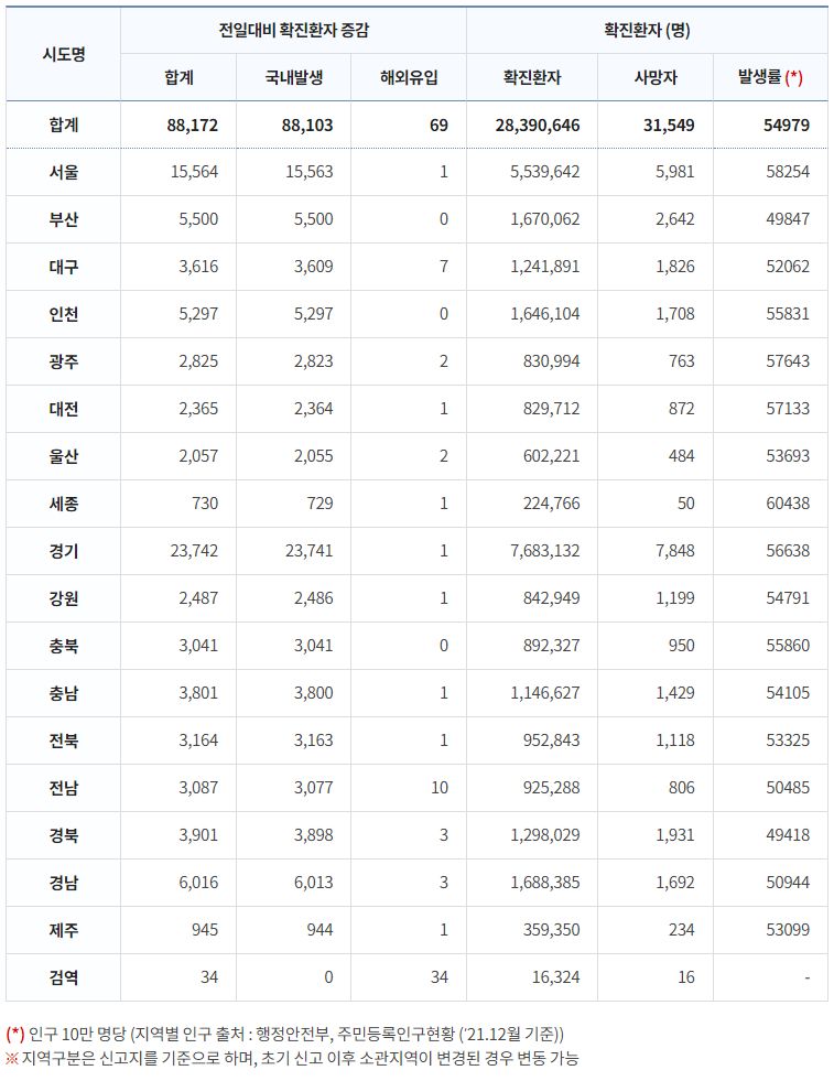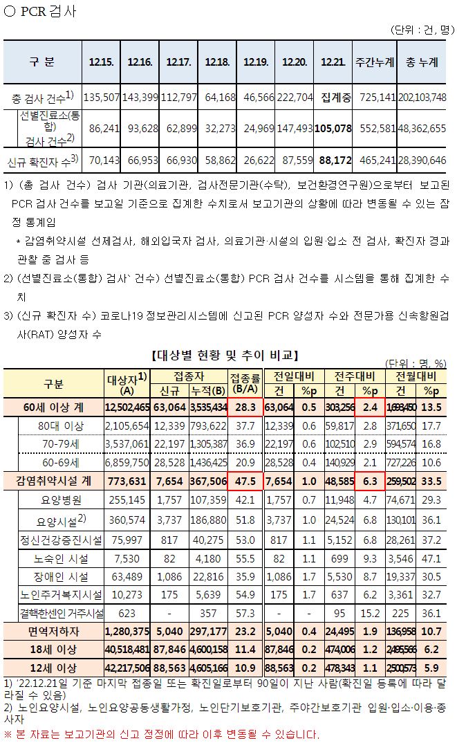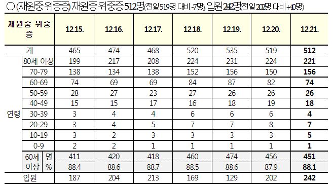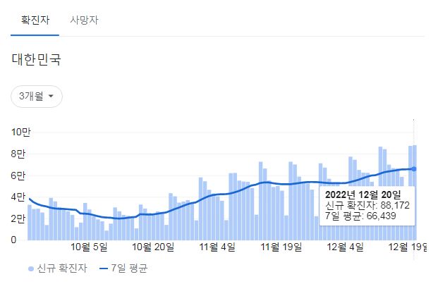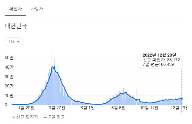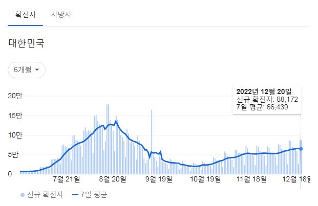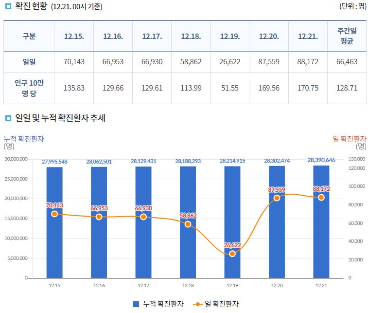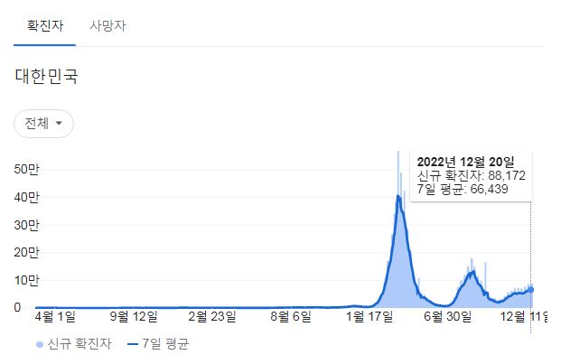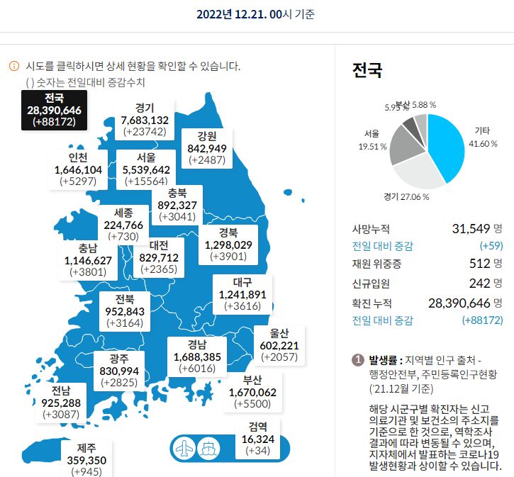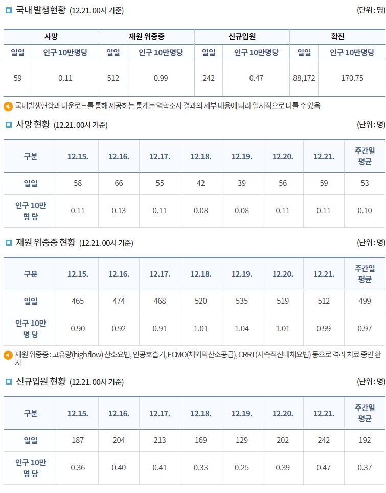 코로나19집계(2022.12.21. 0시기준): 확진 +8.8만, 사망 +59명, 중환자병상가동률 37% 본문