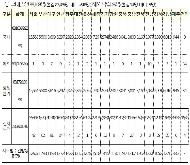 재택치료자수는 아래 표에서 7일간의 신규확진자합계에서 7일간의 신규입원자합계를 빼면 비슷합니다.