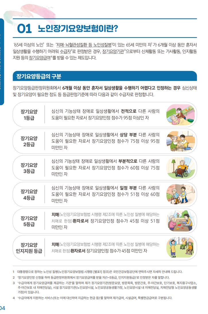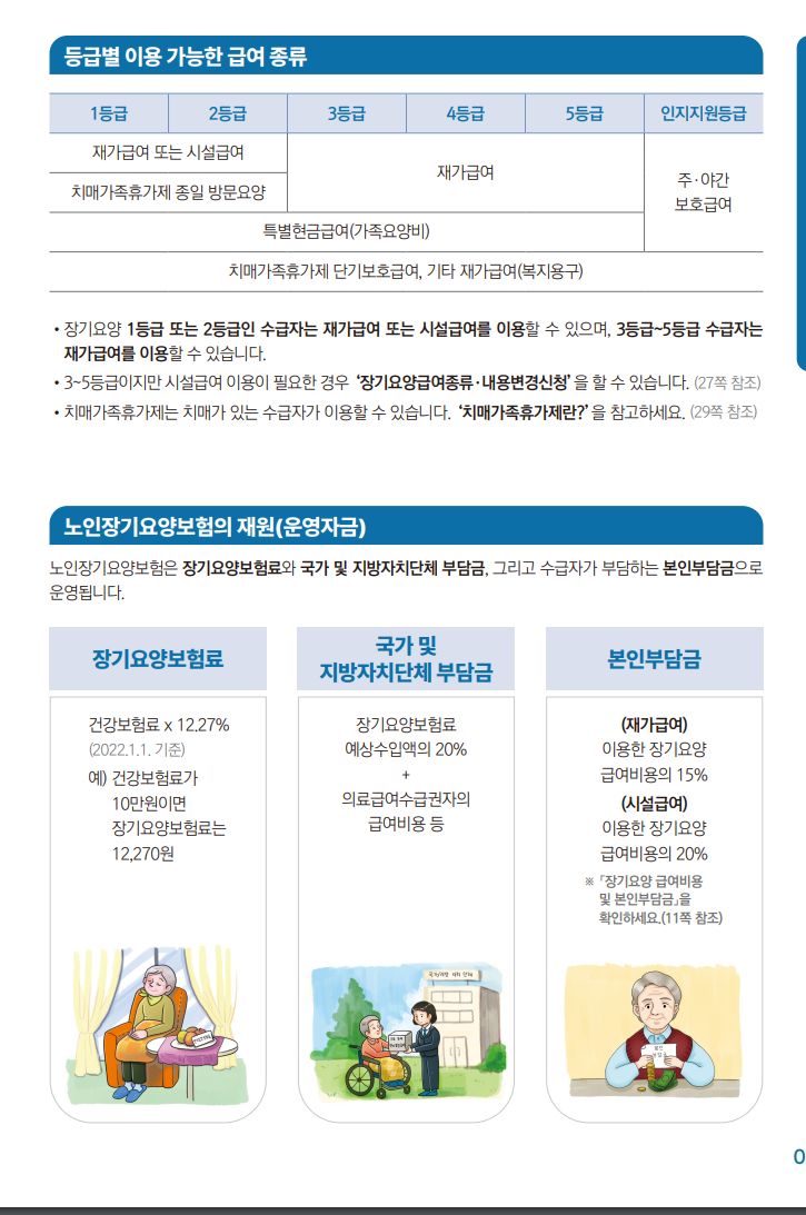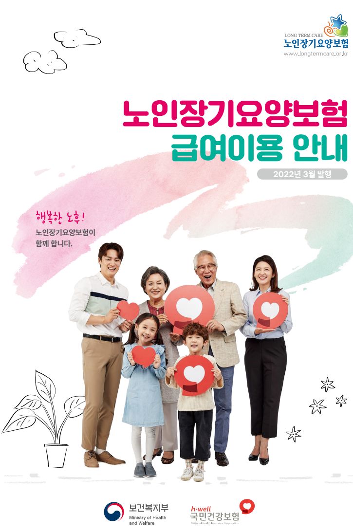 "국민건강보험공단"에 "건강보험료"를 낼 때 "장기요양보험료"도 같이 내죠? 나이들어 치매, 파킨슨병, 또는 다른 질병으로 돌봄이 필요할 때 도움이 되는 것입니다. 그 제도에 대한 소개 책자와 동영상입니다. 기본적으로 65세 이상일 때 해당하며, 몇 가지 중중 노인성 질환에 걸린 사람이라면 그 연령 전에도 수급대상이 될 수 있습니다(둘 다 자동적으로 되는 것은 아니고, 인정절차가 있습니다). 보험이란 게 그렇듯 해당없이 건강하게 사는 것이 제일 좋지만요.