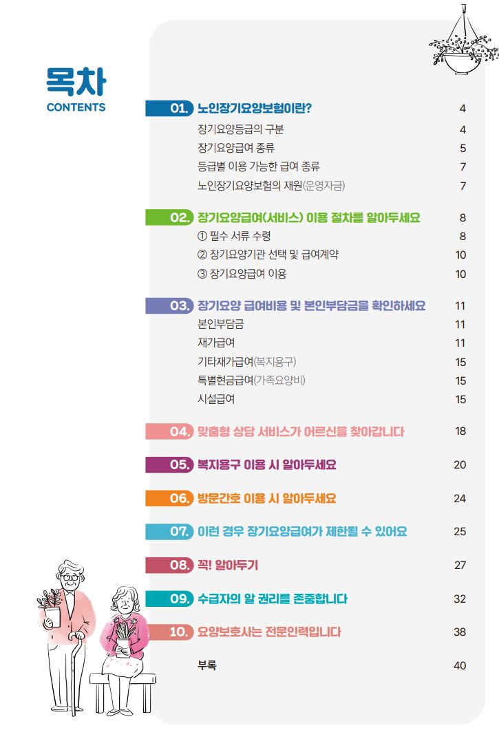 노인장기요양보험급여이용안내e-book Ο 노인장기요양보험이란? Ο 장기요양급여(서비스) 이용 절차 Ο 장기요양급여비용 및 본인부담금 Ο 맞춤형 상담 서비스 Ο 복지용구 및 방문간호 Ο 급여 제