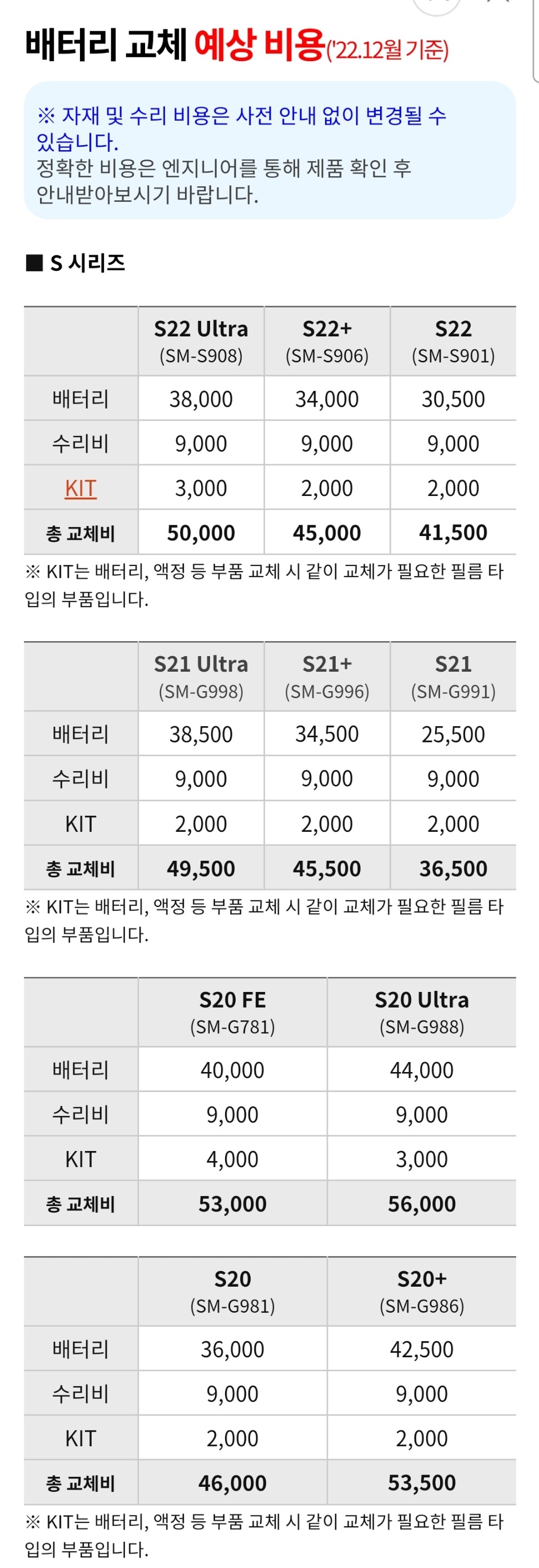 (2022.12) 삼성전자 갤럭시 S시리즈 배터리교체비용 본문