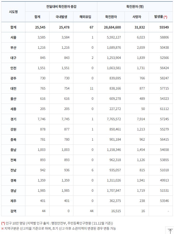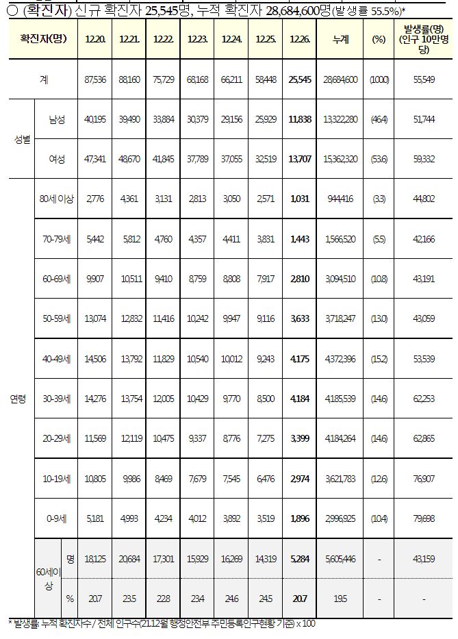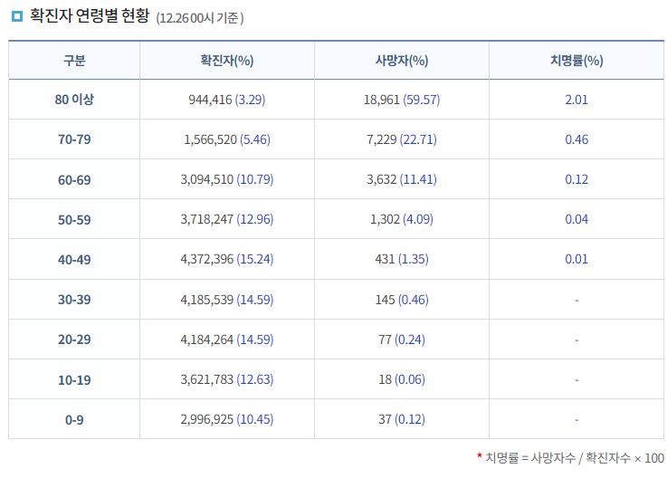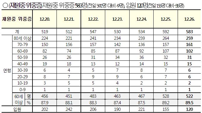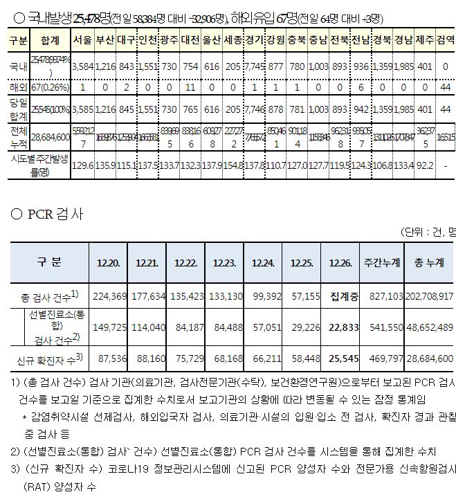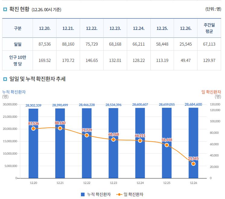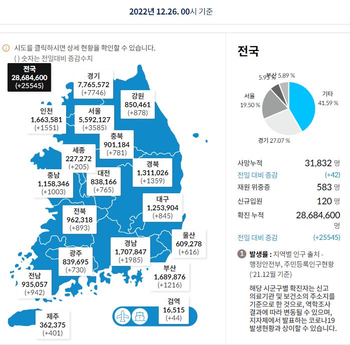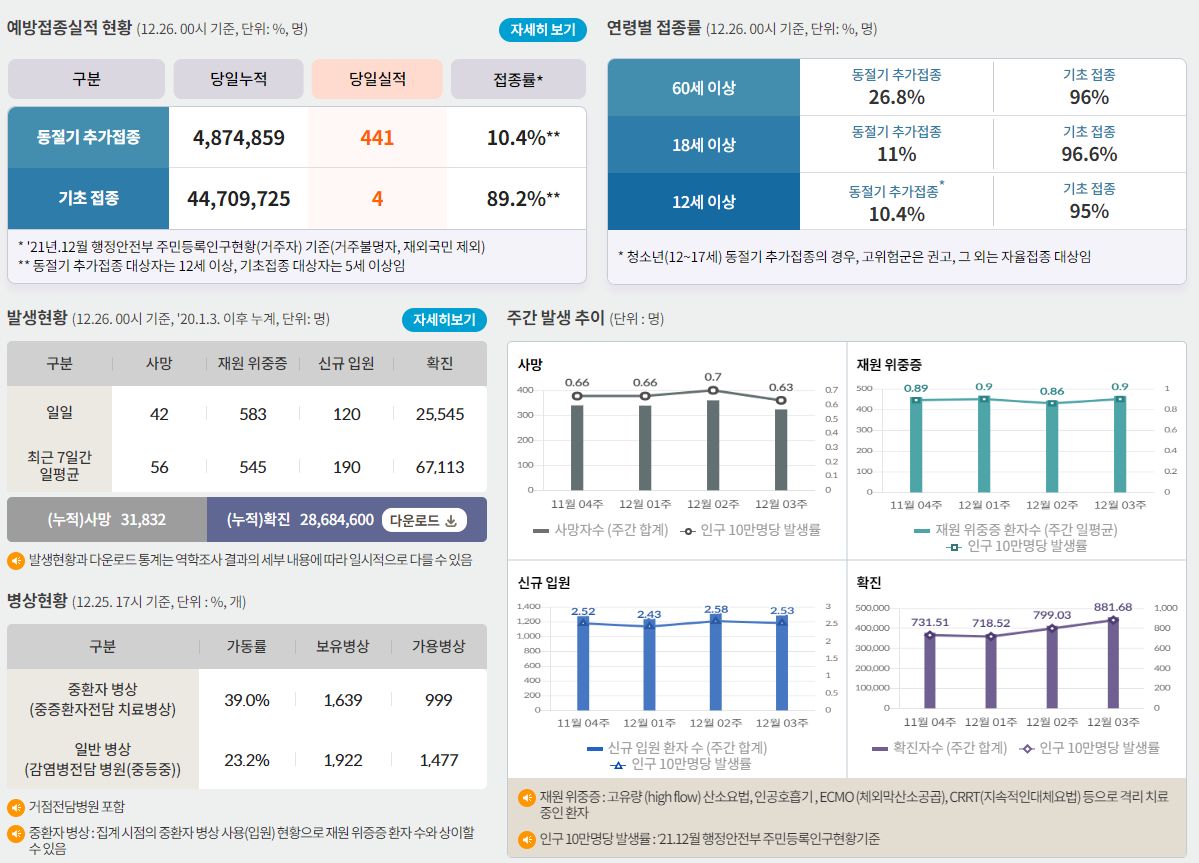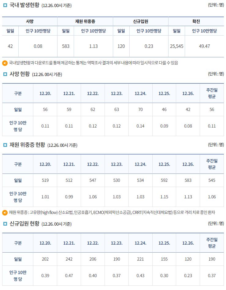 코로나19집계(2022.12.26. 0시기준): 확진 +2.6만, 사망 +42명, 중환자병상가동률 39% 본문