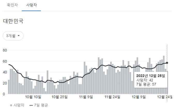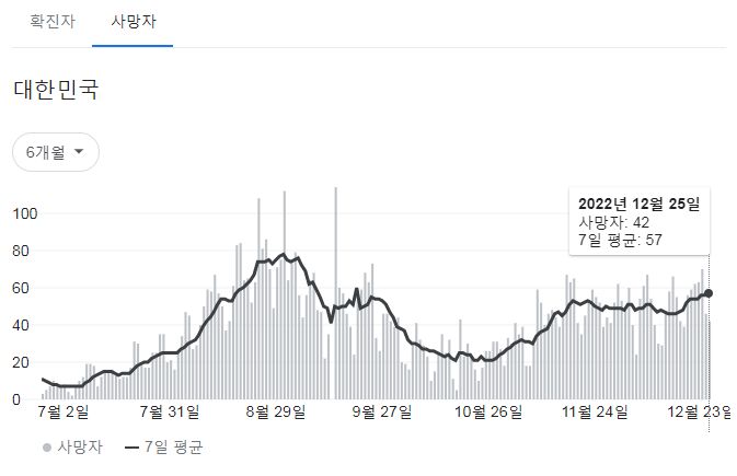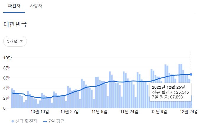 | 코로나19집계(2022.12.25. 0시기준): 확진 +5.8만, 사망 +46명, 중환자병상가동률 39% (0) | 2022.12.25 |