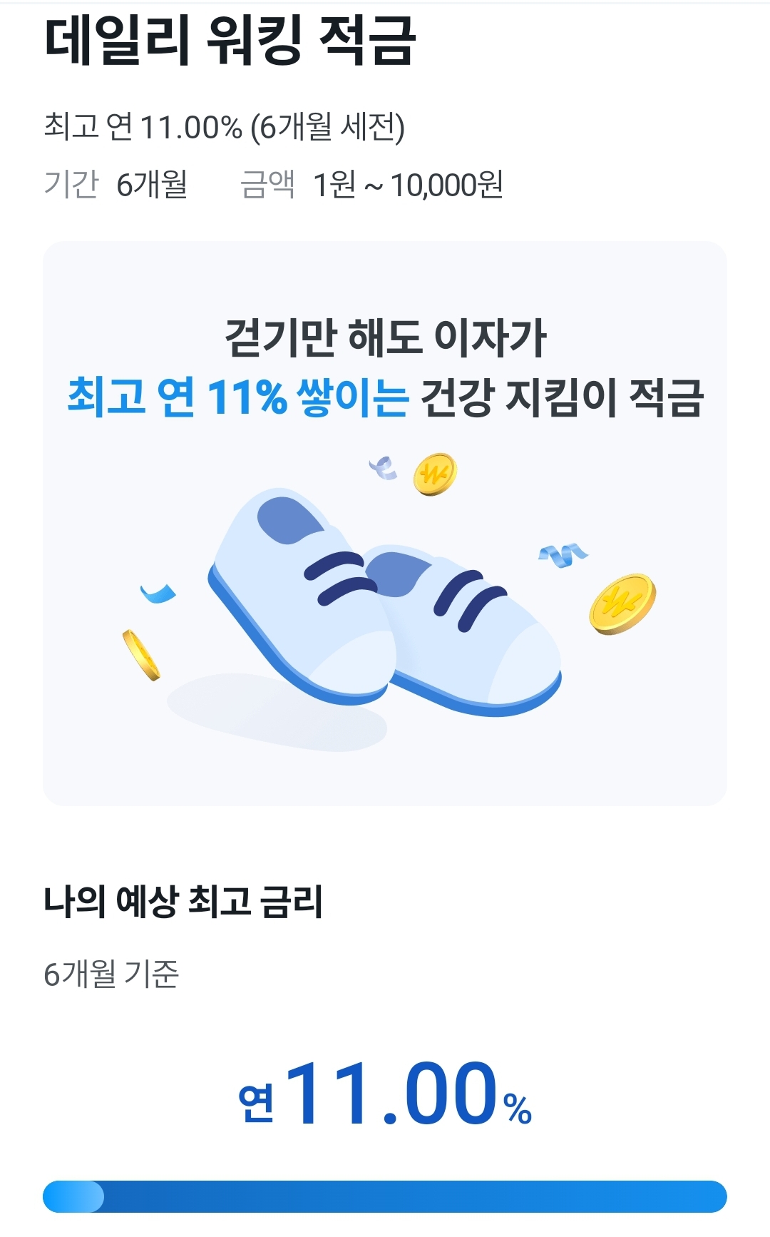 이달에 이벤트로 가입가능했던 정기적금입니다. "매일 입금"이면서 "매일 1만 보 걷기" 조건 우대금리. 워킹 = walking
