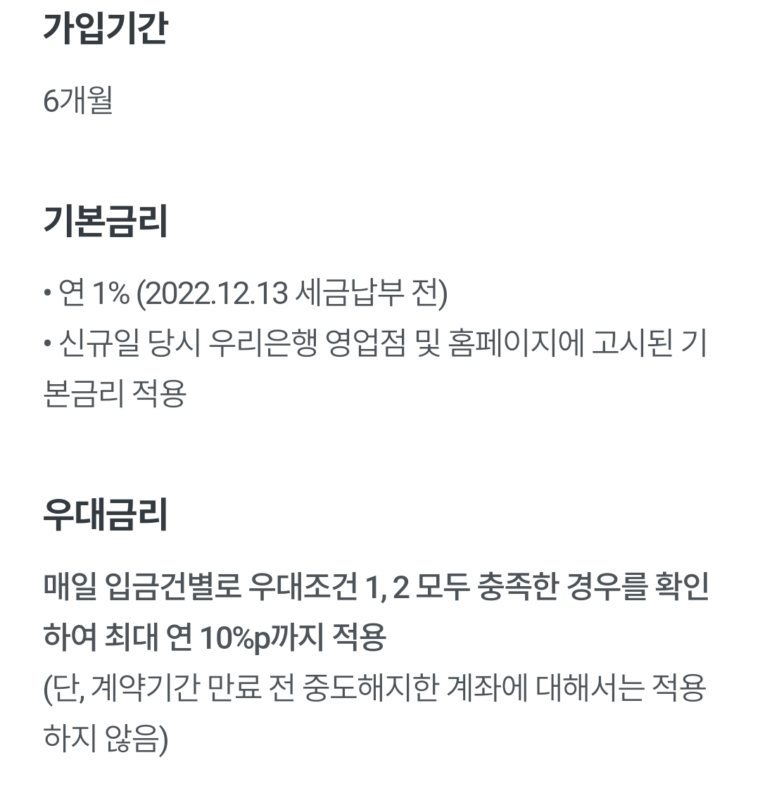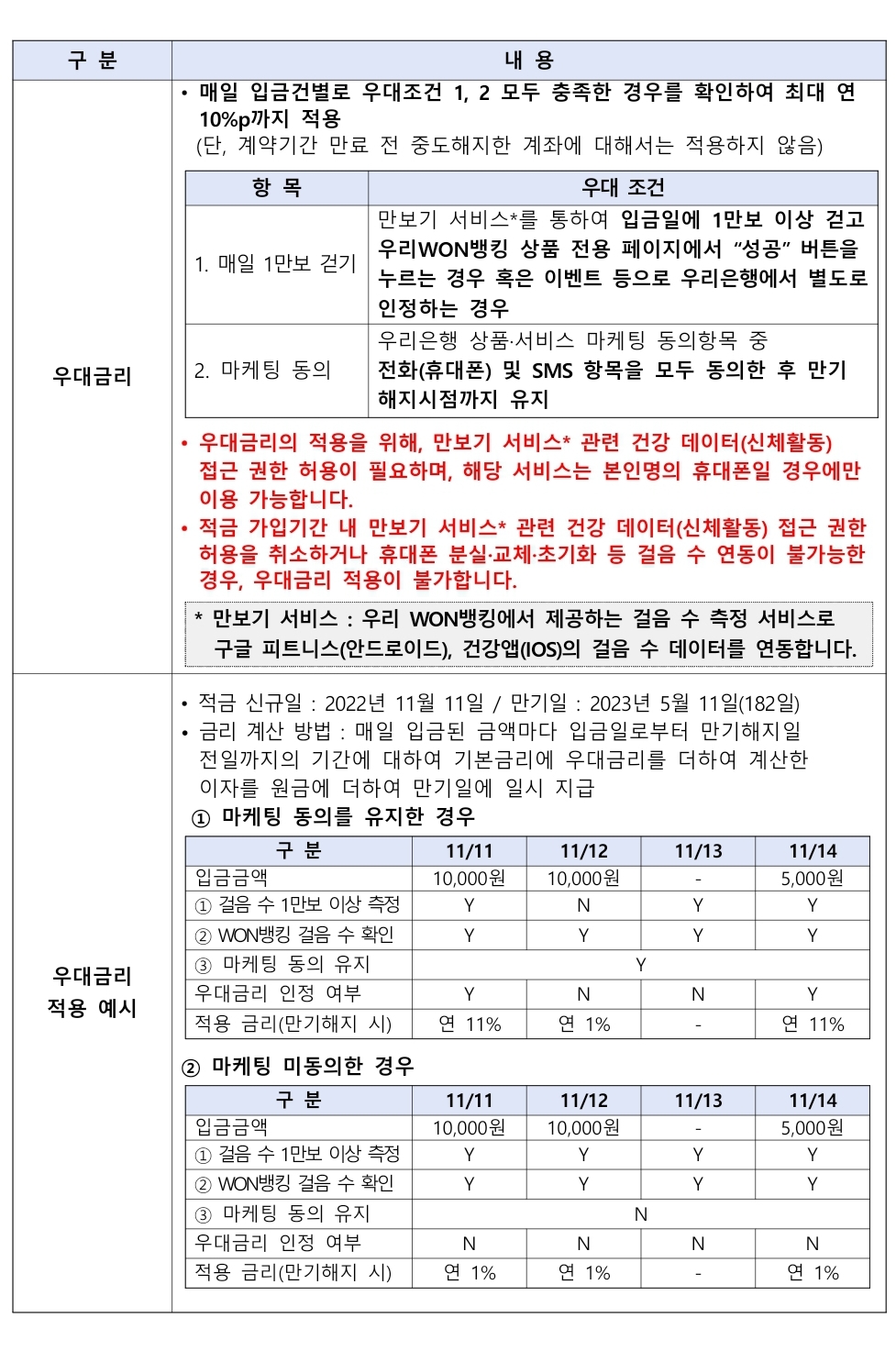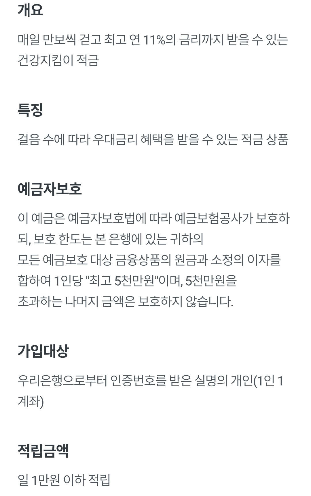 ㅡ 구글 피트니스(아이폰은 건강앱)와 연동해 1만 보 이상 걷고 우리은행앱을 열어 해당 페이지에서 "성공"을 누르면 그날의 입금액은 우대금리 +10%를 적용해 11% 이율 적용.
