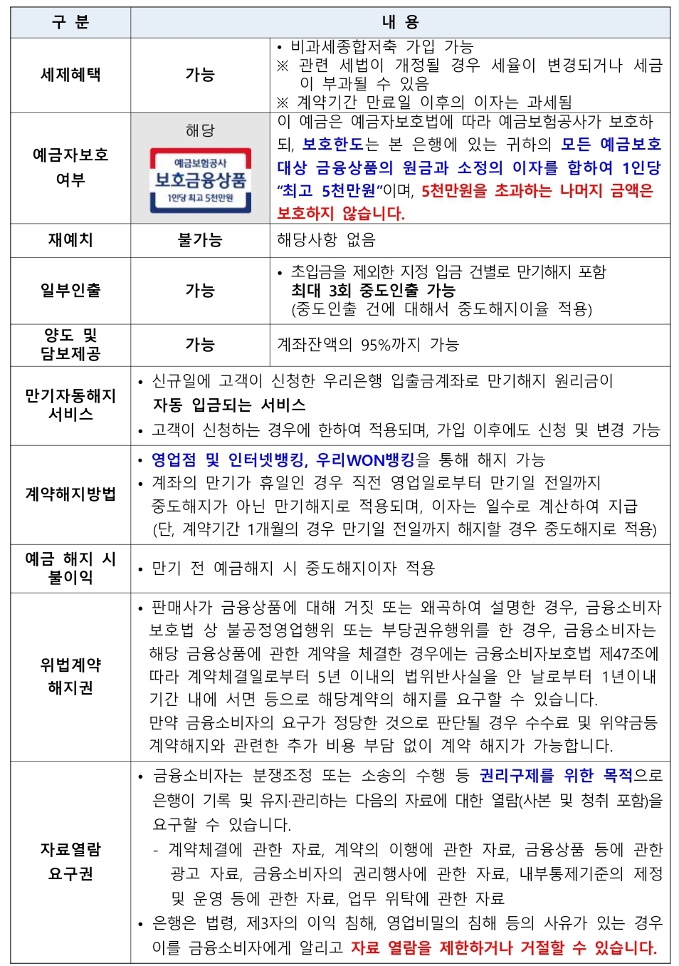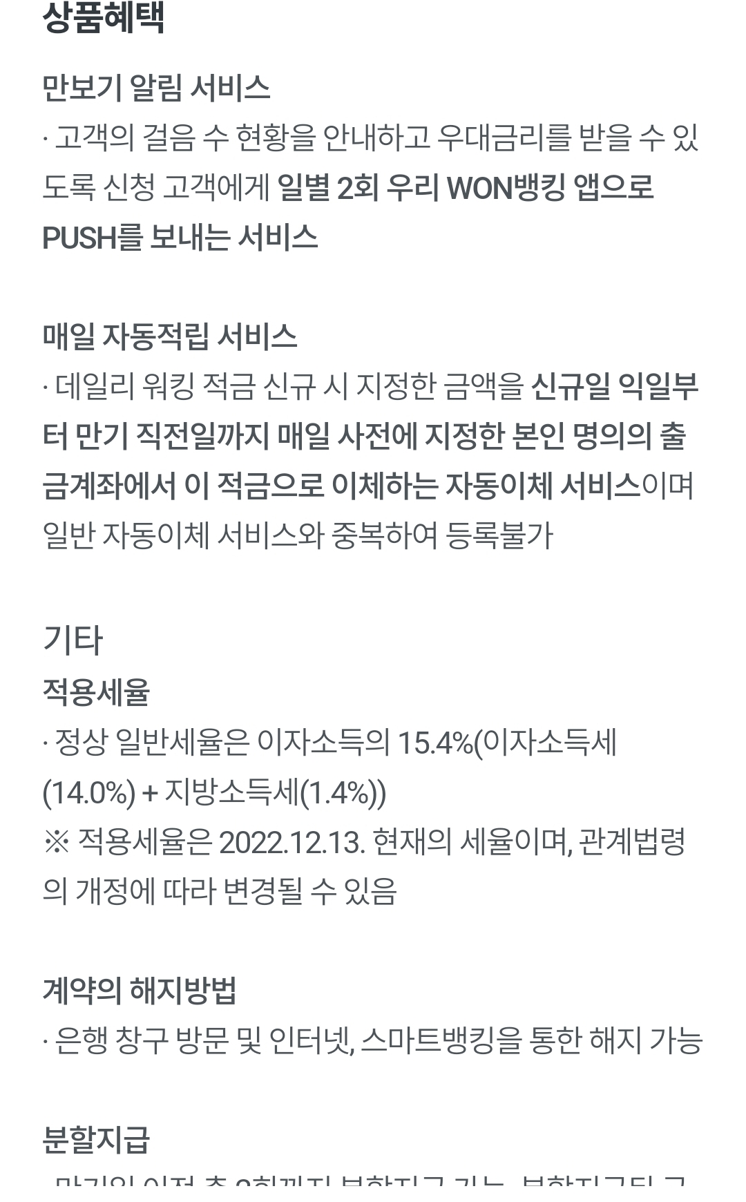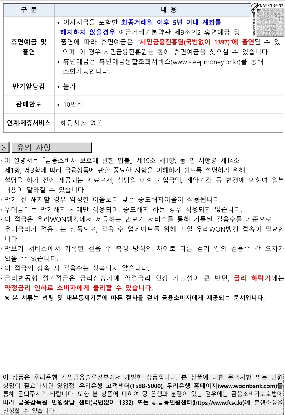 ㅡ 구글 피트니스(아이폰은 건강앱)와 연동해 1만 보 이상 걷고 우리은행앱을 열어 해당 페이지에서 "성공"을 누르면 그날의 입금액은 우대금리 +10%를 적용해 11% 이율 적용.