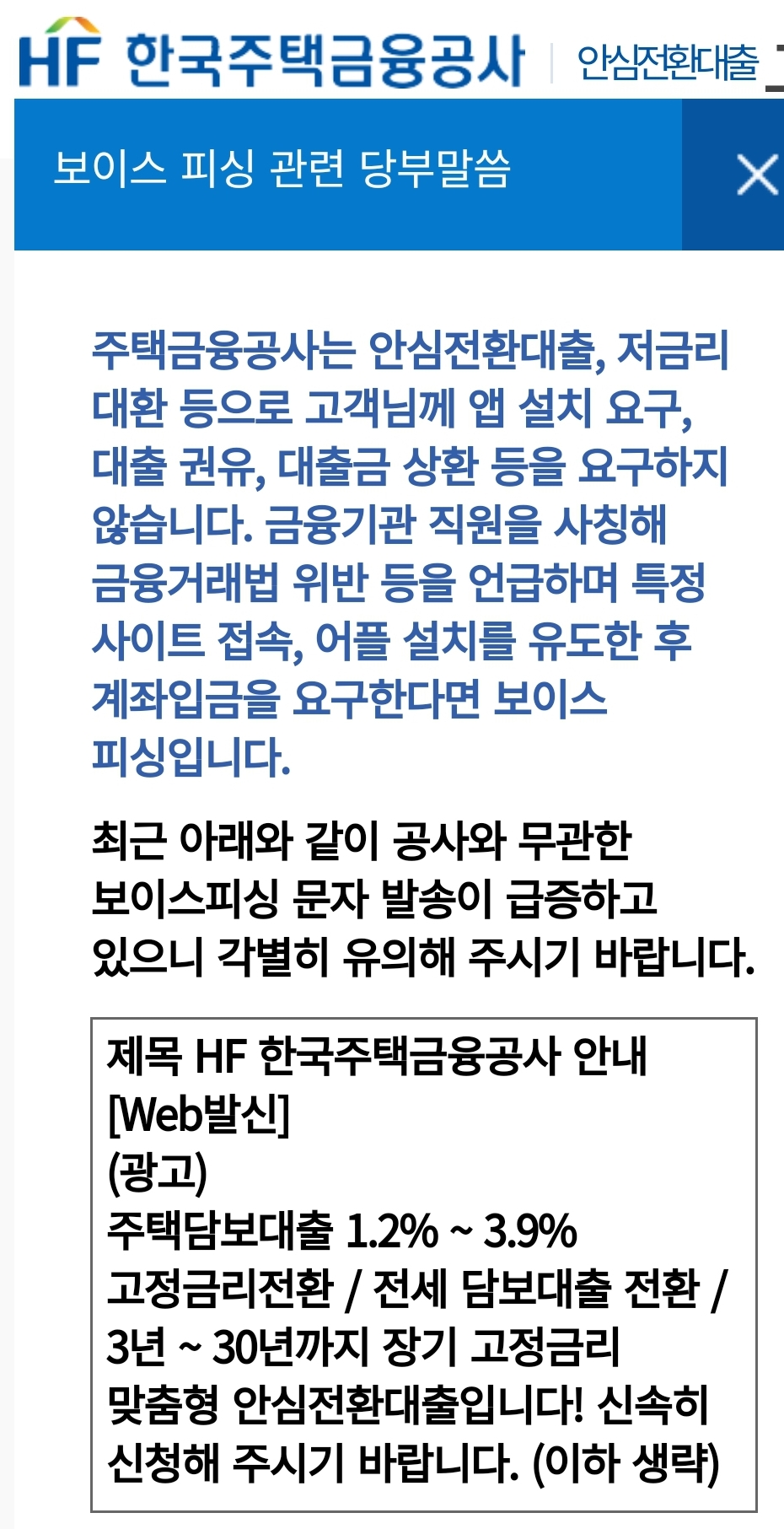 ㅡ 한국주택금융공사의 안심전환대출을 빙자한 보이스피싱/ 스미싱 금융사기가 많으니 조심하라는 알림: