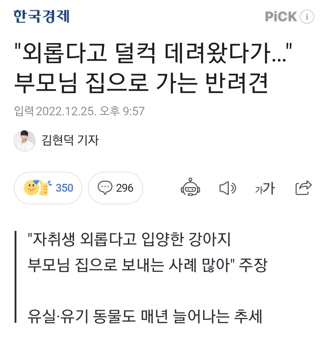 첫 번째 기사는 남일이 아니라서요.. 저래놓고 나중에 강아지를 새로 들여놓으려다 주변에서 "그럴 것 같으면 네가 맡겨놓은 얘를 데려가라"며 한 소리씩 하기도.