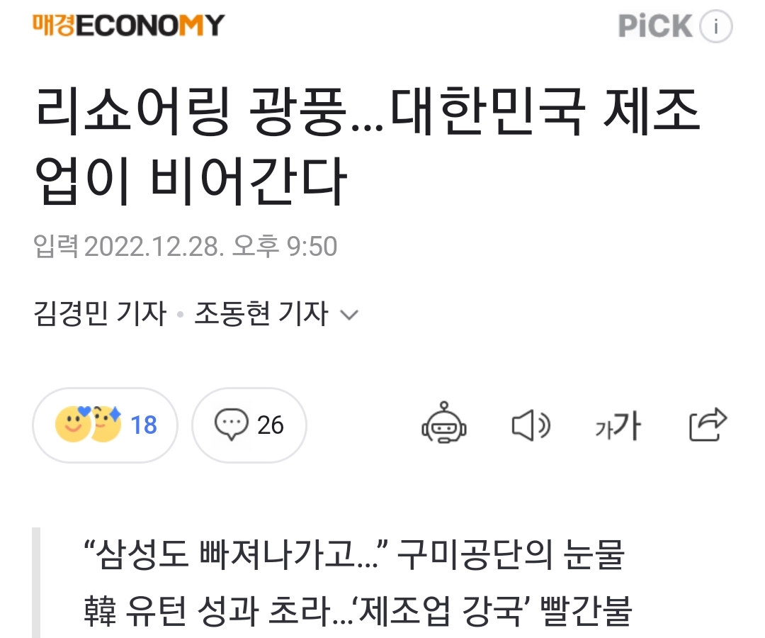 기사의 도입부는 삼성엘지공장이 해외거점으로 이전하며 협력업체들도 동반진출해 휑하니 비어버린 구미공단. 물류든 ESG든 인적자원이든 아니면 제도적 지원이든 이점을 내세우지 못하면 국내 다른 지방공단2도 이렇게 될 것.