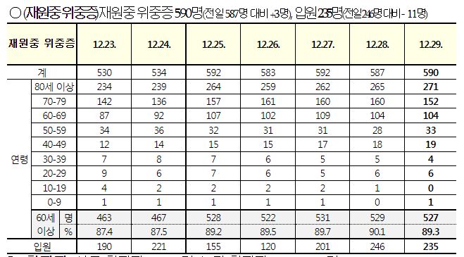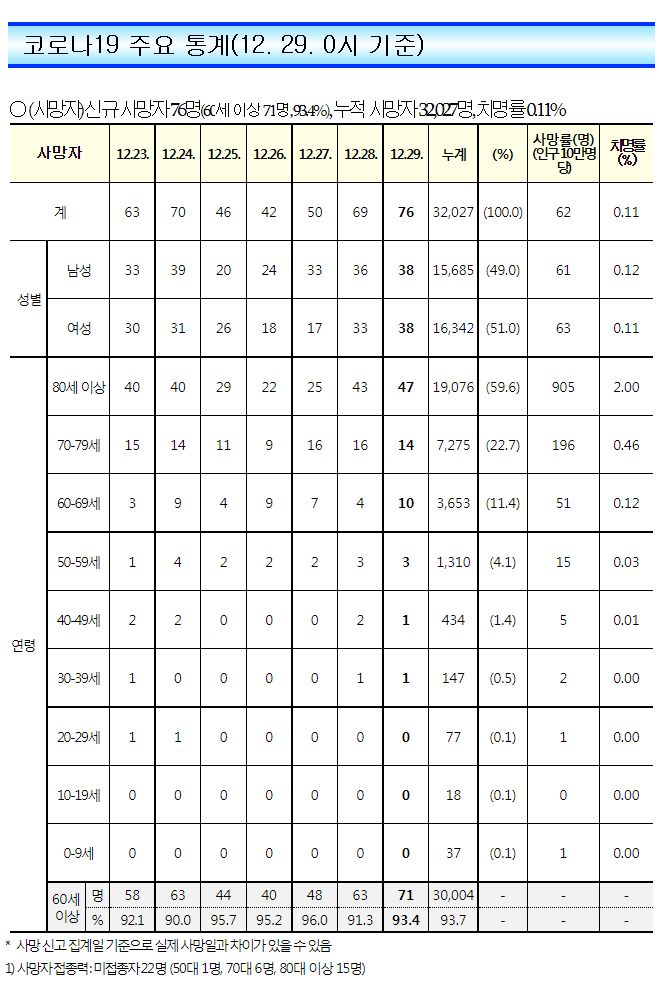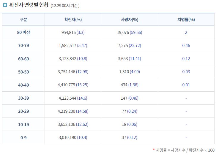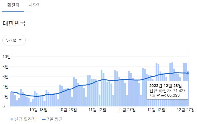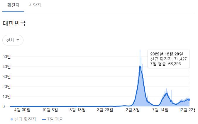 코로나19집계(2022.12.29. 0시기준): 확진 +7.1만, 사망 +76명, 중환자병상가동률 39% 본문
