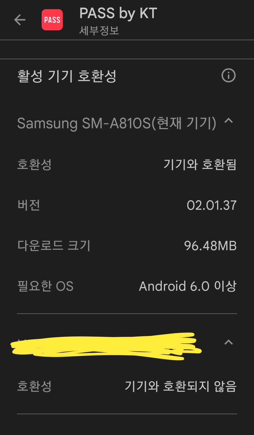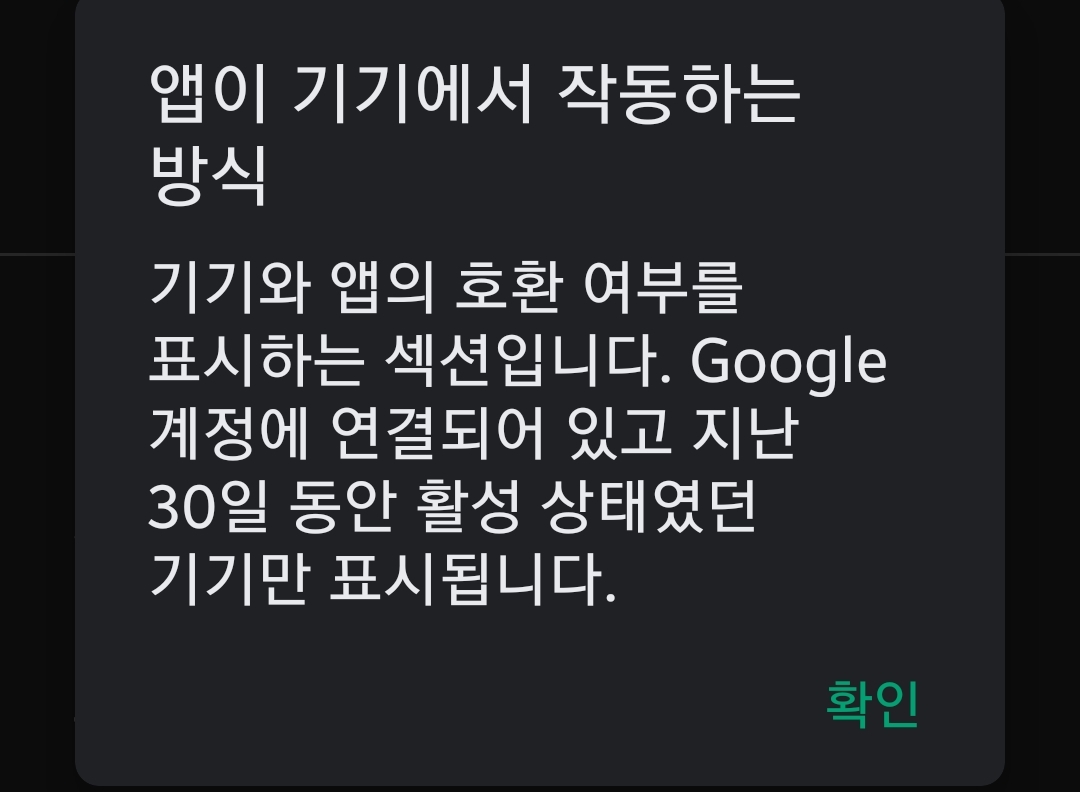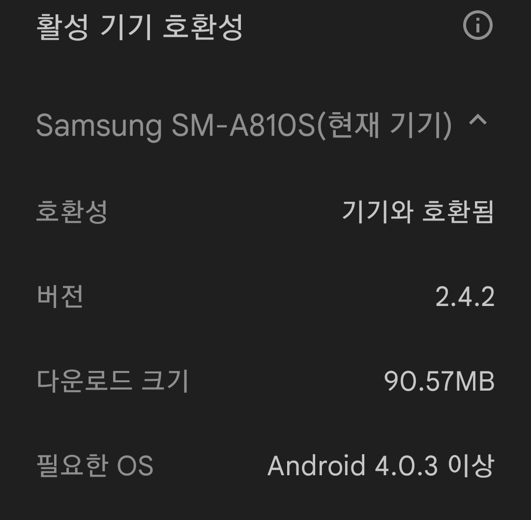 8.0 폰에서 플레이스토어를 실행해 검색하면 이렇게 호환성 정보를 볼 수 있습니다. 내 단말기 중에 되는 놈 안 되는 놈이 보이죠.