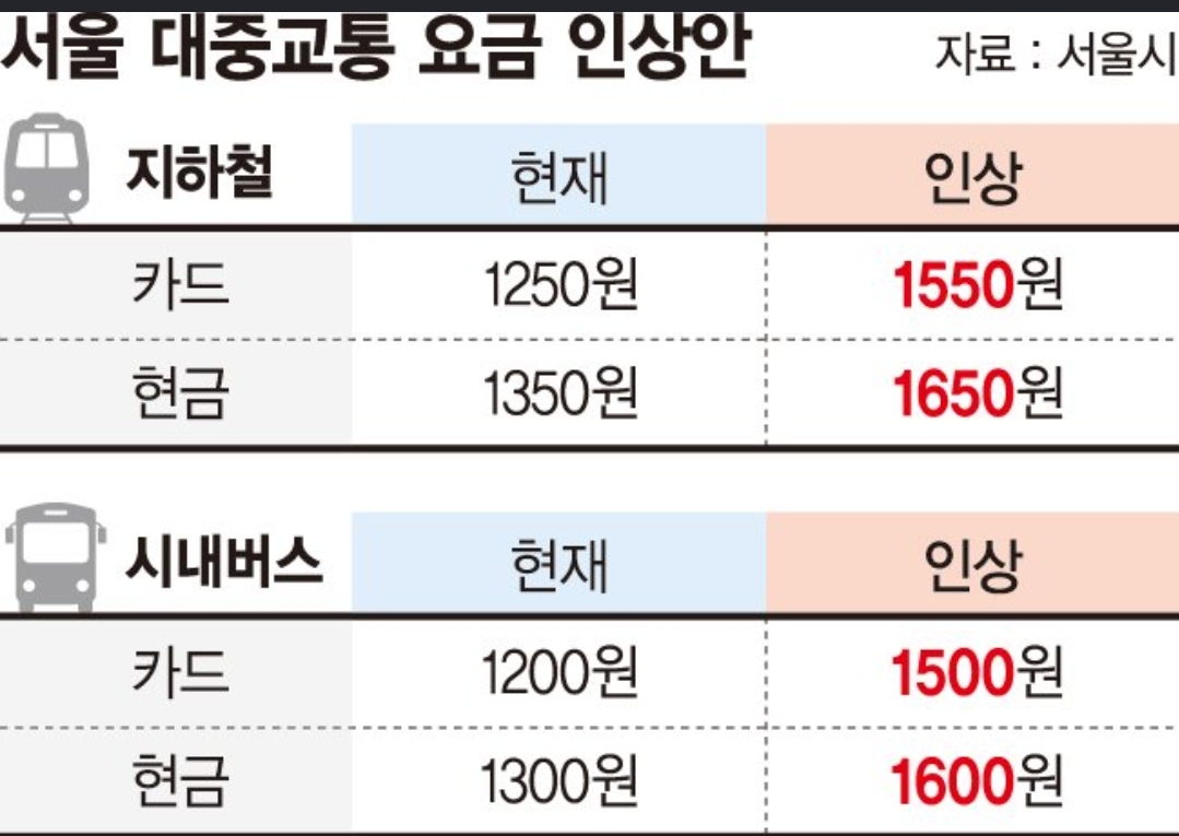 지하철과 시내버스 모두 300원씩 올리는 안. 기사에 따르면 현재 서울시 대중교통요금은 경기도보다 싸다고 합니다.