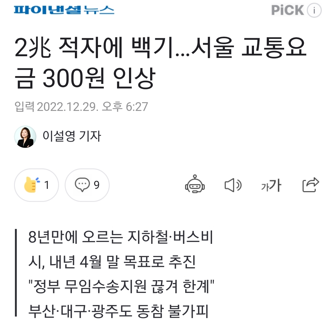 이번 인상안의 명분은 전국 지자체가 공통으로 가지고 있고, 도시철도공사 등 운영사의 노조 역시 오래 전부터 정부가 이 문제를 모른 체하지 말라고 요구해온 만큼, 이번 인상안은 봄이 되기 전까지 정부에게 성의를 보이라는 마지막 압박이 될 것 같네요.