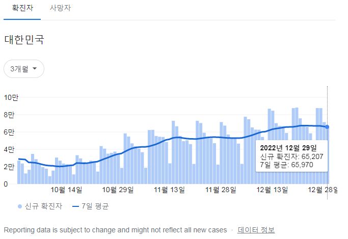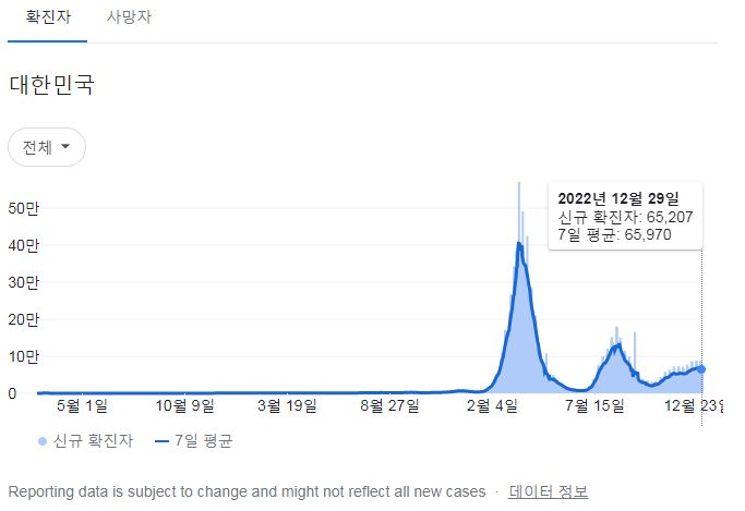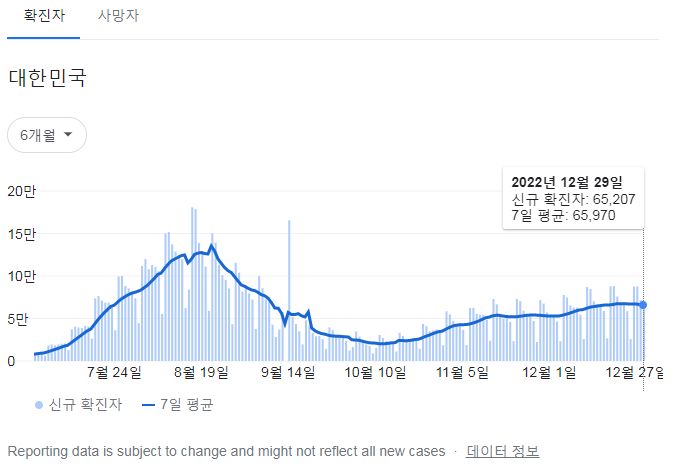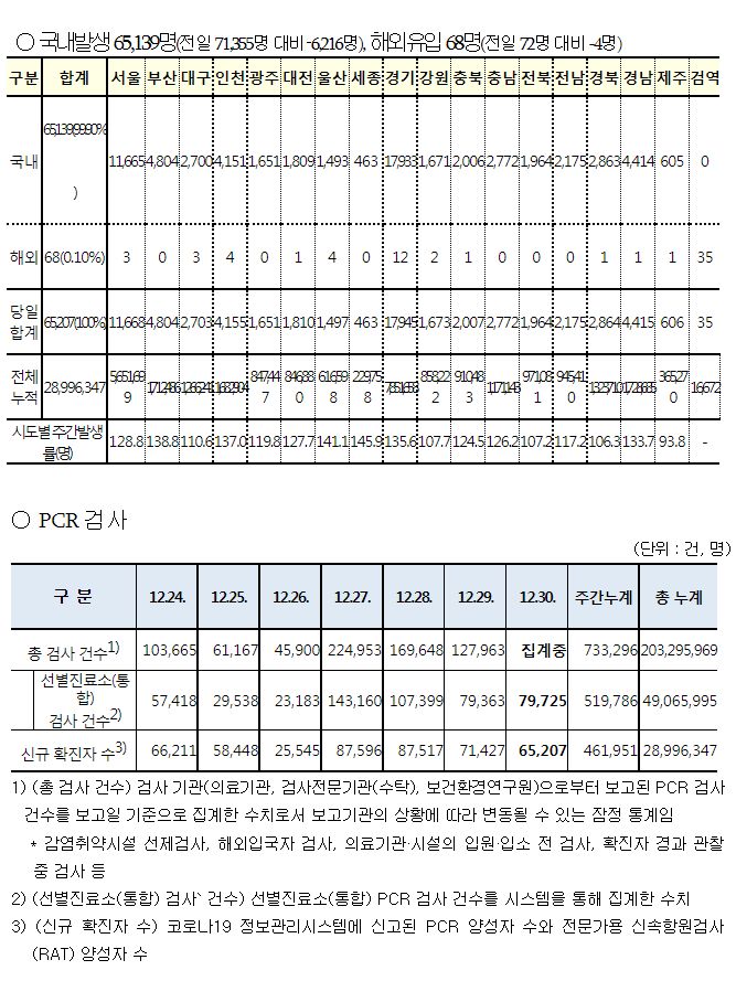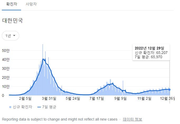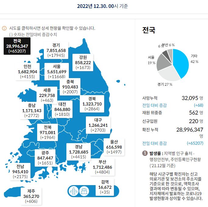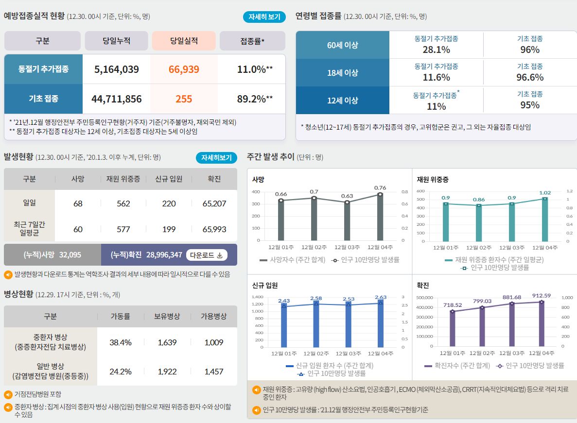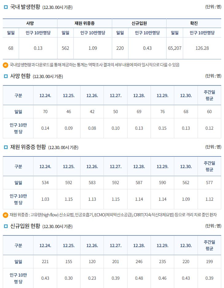 코로나19집계(2022.12.30. 0시기준): 확진 +6.5만, 사망 +68명, 중환자병상가동률 38% 본문