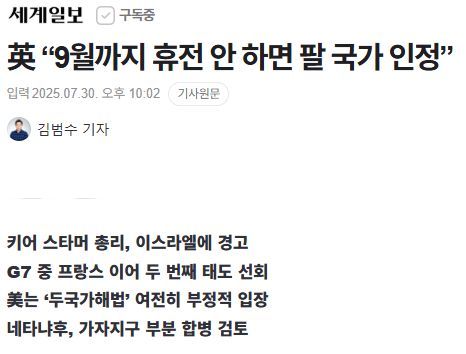 키어 스타머 총리, 이스라엘에 경고 G7 중 프랑스 이어 두 번째 태도 선회 美는 ‘두국가해법’ 여전히 부정적 입장 네타냐후, 가자지구 부분 합병 검토 프랑스에 이어 영국이 이스라엘에 9월까