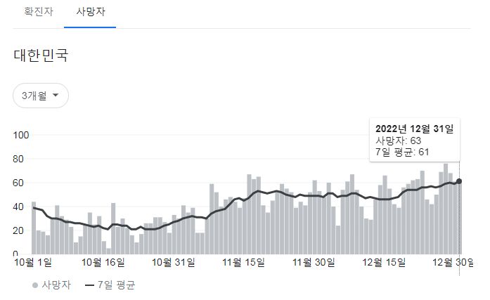 | 코로나19집계(2022.12.31. 0시기준): 확진 +6.3만, 사망 +61명, 중환자병상가동률 38% (0) | 2022.12.31 |