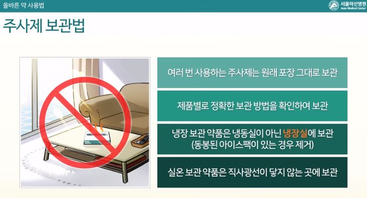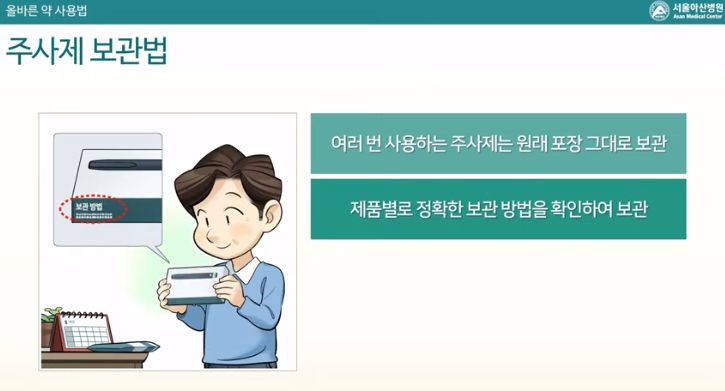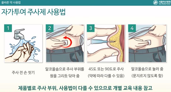 일반적으로 "주사제"라고 하면 전문가에 의해 병원에서만 사용한다고 생각하지만, 일부 주사제는 환자 스스로 투여가 가능한데, 이를 "자가투여 주사제"라고 합니다. 자가투여 주사제는 의료진에게 주사 방법에 대한 충분한 교육을 받은 후 사용해야 합니다. - 서울아산병원