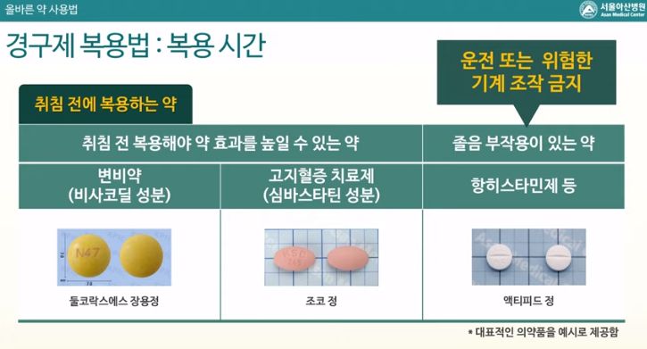 자기 전에 먹어야 효과를 높일 수 있는 약(비사코딜 성분 번비약, 심바스타틴 성분 고지혈증 치료제), 졸음부작용이 있는 항히스타민제 등.