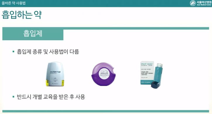 흡입제: 약별로 사용법이 다르므로 반드시 개별 교육을 받은 다음에 사용하기.