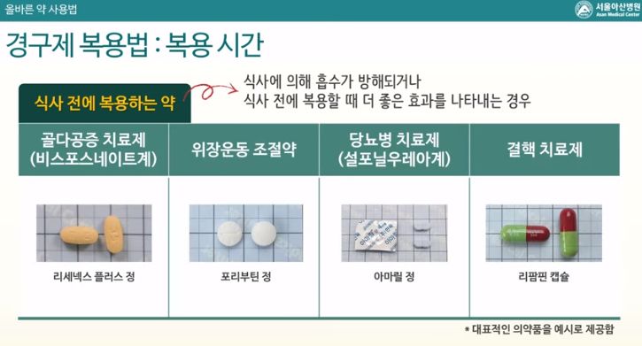 식사에 의해 흡수가 방해되거나 식사 전에 복용할 때 효과가 더 좋은 경우