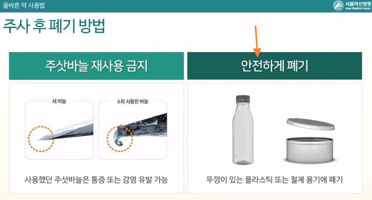 뚜껑이 있는 플라스틱 또는 철제 용기에 폐기. 주삿바늘이 사람을 찌르는 사고가 나지 않도록.