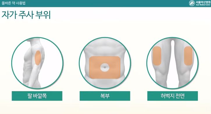 자가주사부위: 팔 바깥쪽, 복부(세부설명있음), 허벅지 전면