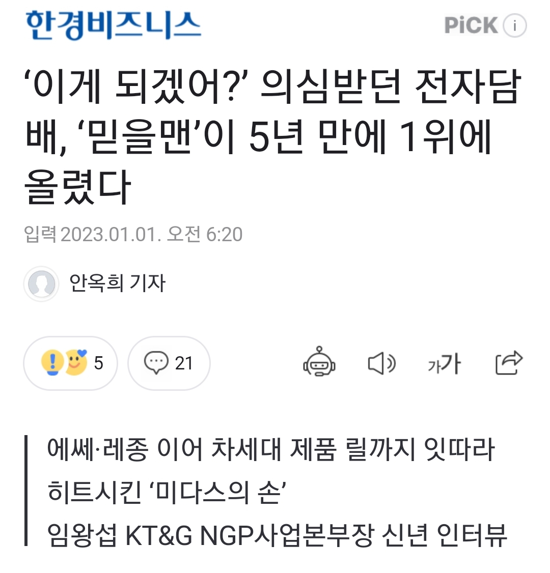 ‘이게 되겠어?’ 의심받던 전자담배, ‘믿을맨’이 5년 만에 1위에 올렸다