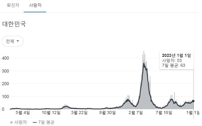 | 코로나19집계(2023.1.4. 0시기준): 확진 +7.9만, 사망 +54명, 중환자병상가동률 40% (0) | 2023.01.04 |