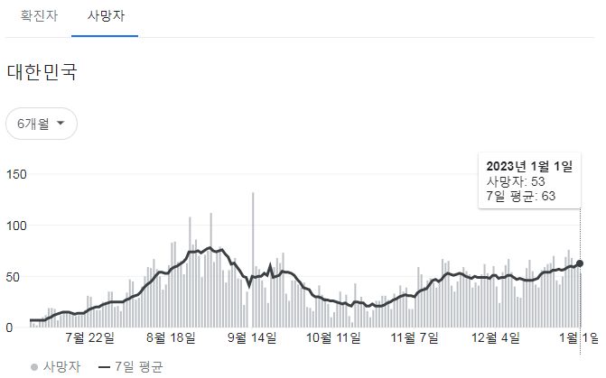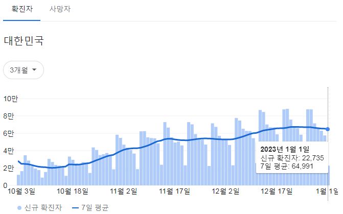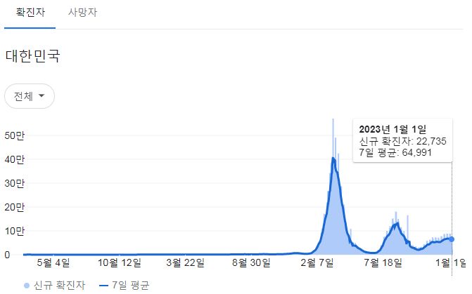 | 코로나19집계(2023.1.1. 0시기준): 확진 +5.8만, 사망 +63명, 중환자병상가동률 38% (0) | 2023.01.01 |