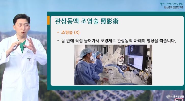관상동맥 조영술. 몸 안에 관을 넣어 조영제가 관상동맥에 들어가도록 해서 관상동맥에 피가 잘 도는지 사진이나 영상을 찍기. 가장 정확하지만 방사선촬영하므로 환자와 의사 모두 노출된다. 필요할 때만 한다.