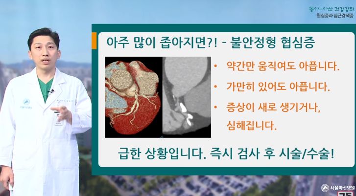 불안정형 협심증: 응급상황이니까 바로 병원와서 즉시 검사 후 시술이나 수술.