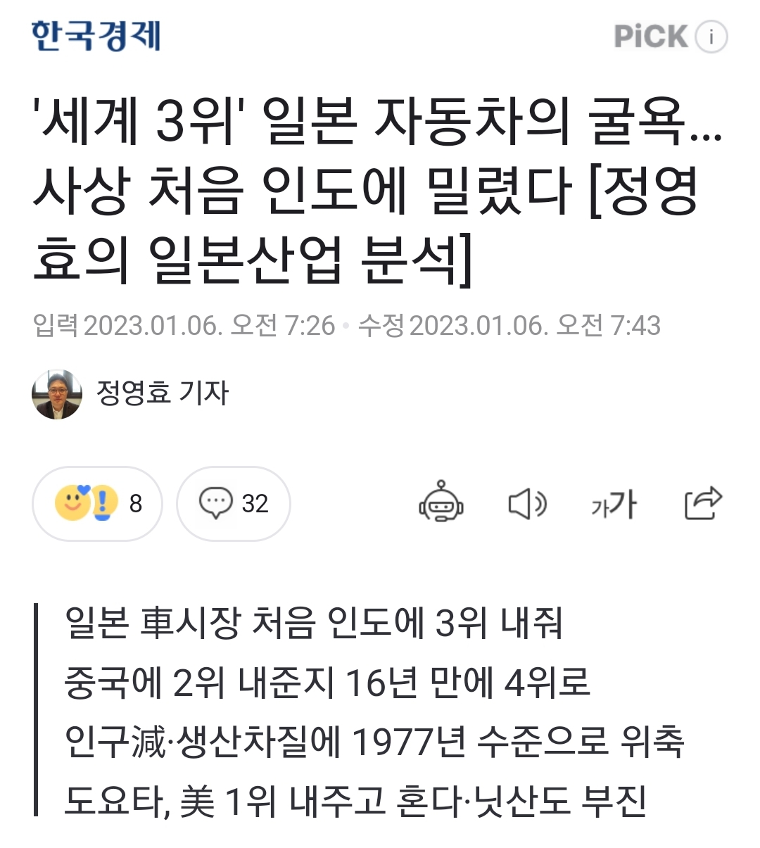 '세계 3위' 일본 자동차의 굴욕…사상 처음 인도에 밀렸다 [정영효의 일본산업 분석]