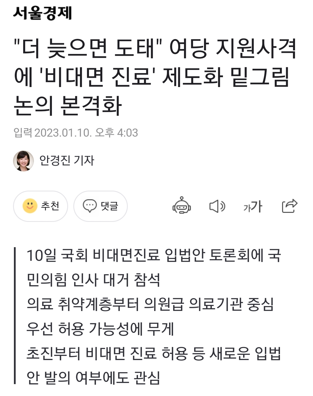 "OECD 38개 회원국 가운데 비대면 진료가 허용되지 않은 나라는 이제 한국뿐" 본문