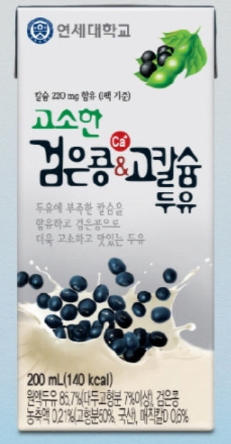 연세두유 중 '고소한 검은콩&고칼슘 두유' 팩과 파우치 포장 등 본문