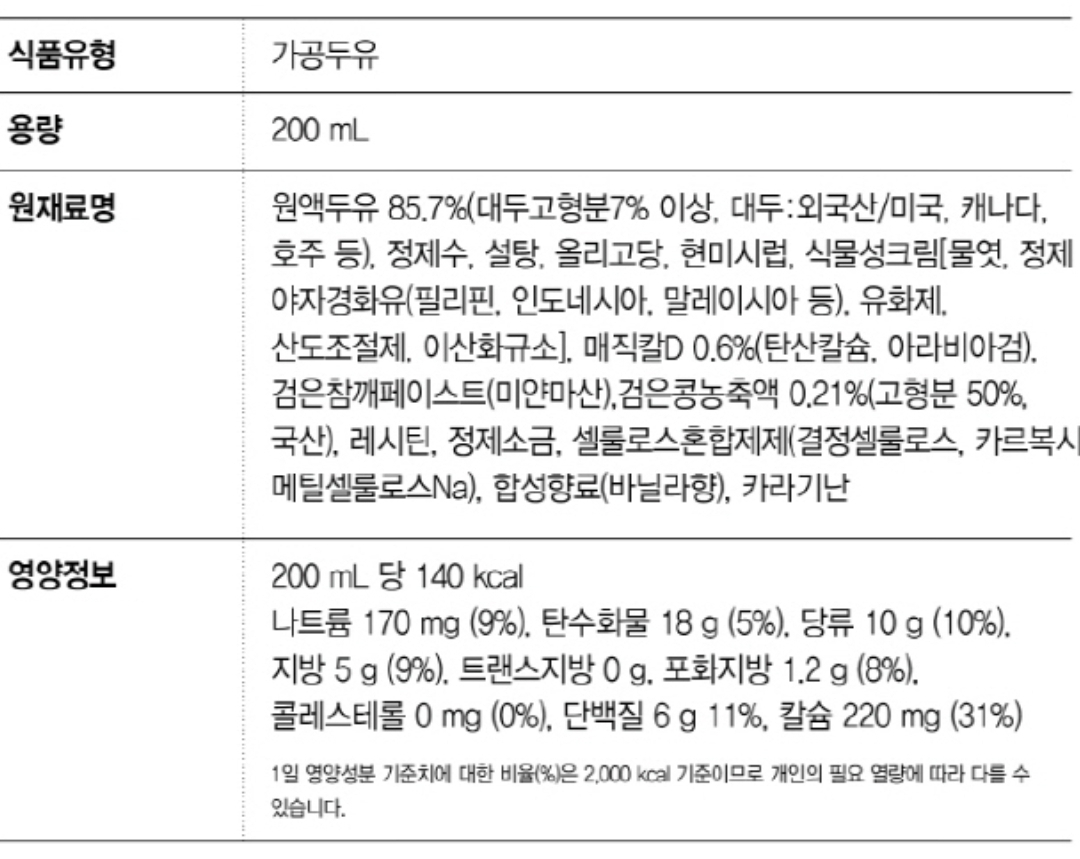 "고소한 검은콩&고칼슘 두유" 는 두유함량이 80%대 중반2 으로 기본 콩두유(90%대 중반)보다 낮으면서 당분이 첨가돼 달콤합니다. 고소한 맛은 깨페이스트 등 다른 첨가물로 낸 모양. 열량은 140칼로리로 당분때문인지 기본 콩두유(120칼로리대)보다 조금 많습니다.