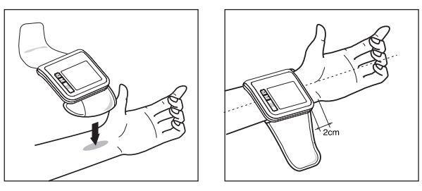 손목이 시작되는 부위에서 2cm 정도 띄고 커프를 감을 것. 측정기 화면이 손등이 아니라 그림과 같이 오도록 찬다.