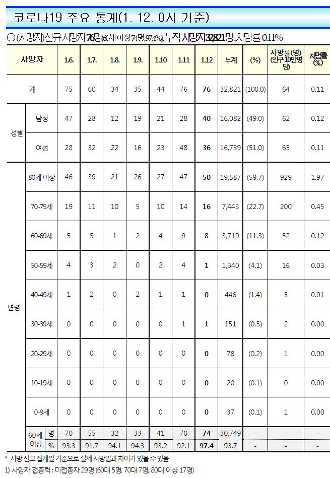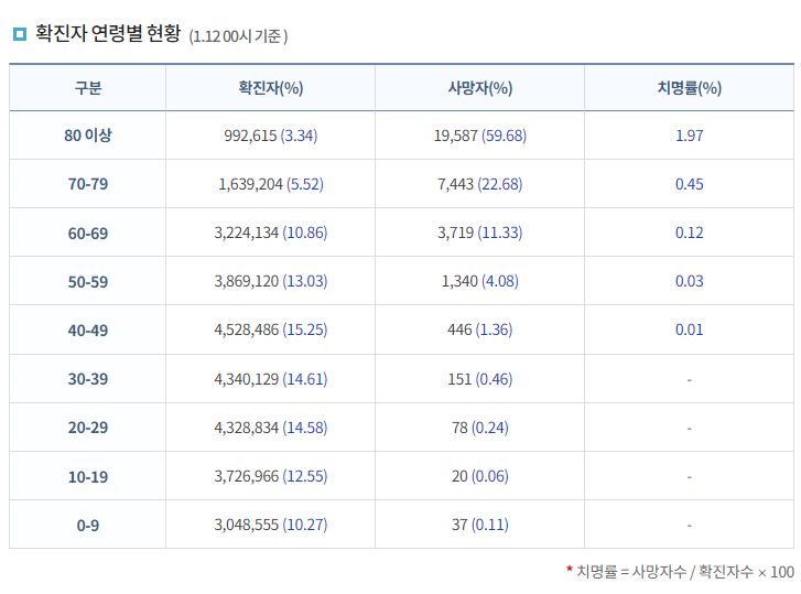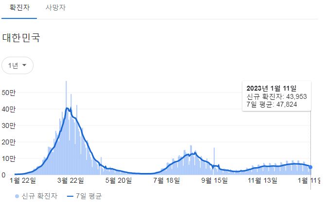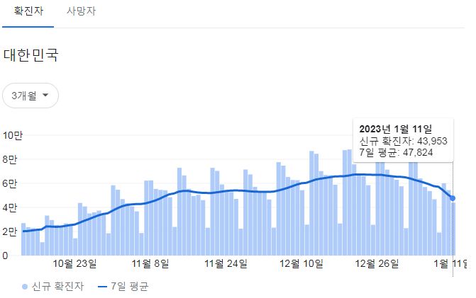 코로나19집계(2023.1.12. 0시기준): 확진 +4.4만, 사망 +76명, 중환자병상가동률 37% 본문