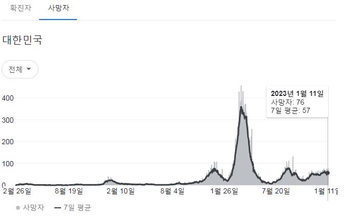 | 코로나19집계(2023.1.11. 0시기준): 확진 +5.4만, 사망 +76명, 중환자병상가동률 38% (0) | 2023.01.11 |